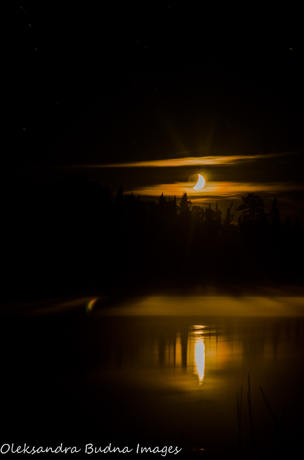 After two days of poor weather, the skies finally cleared up and the wind died. All of a sudden, the whole forest came back to life: chirping, tweeting and trilling with joy. Later that night, a much thicker crescent descended into the lake and stars pierced the black dome, their light sipping towards the earth through millions of tiny holes.