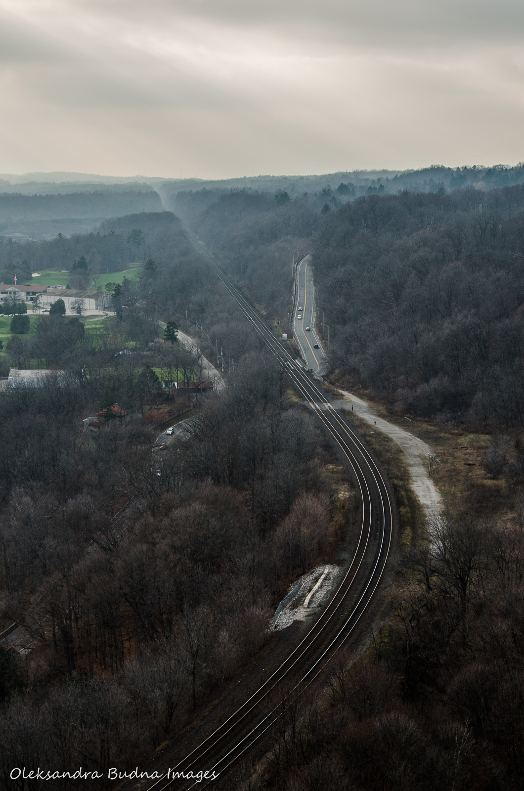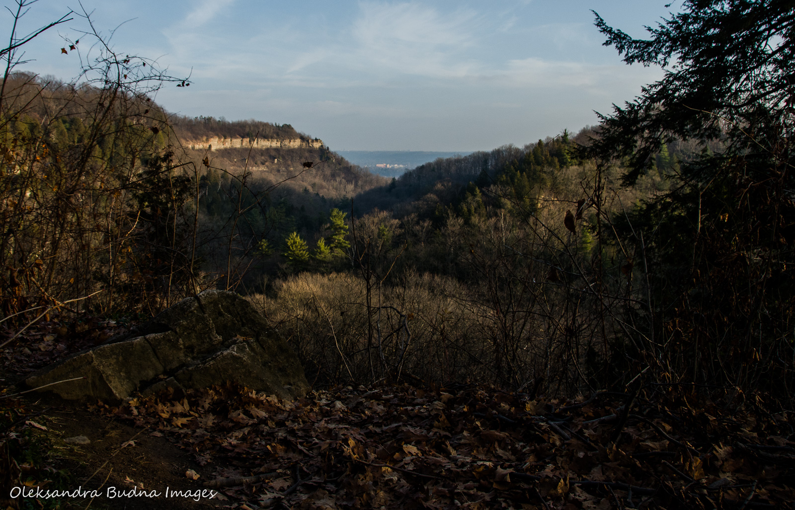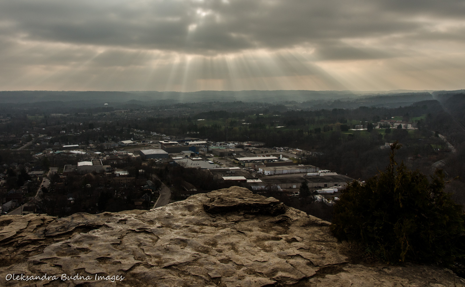 Dundas Peak was our next stop along the trail. Once we reached it, we were treated to well-ordered, checkerboard views of Dundas to one side and rugged Spencer Gorge on the other. Apparently, on a clear day you can see as far as Stoney Creek and Hamilton Harbour. It wasn’t one of those days. However, sunlight streaming though the clouds and misty hills in the distance made for some beautiful pictures.