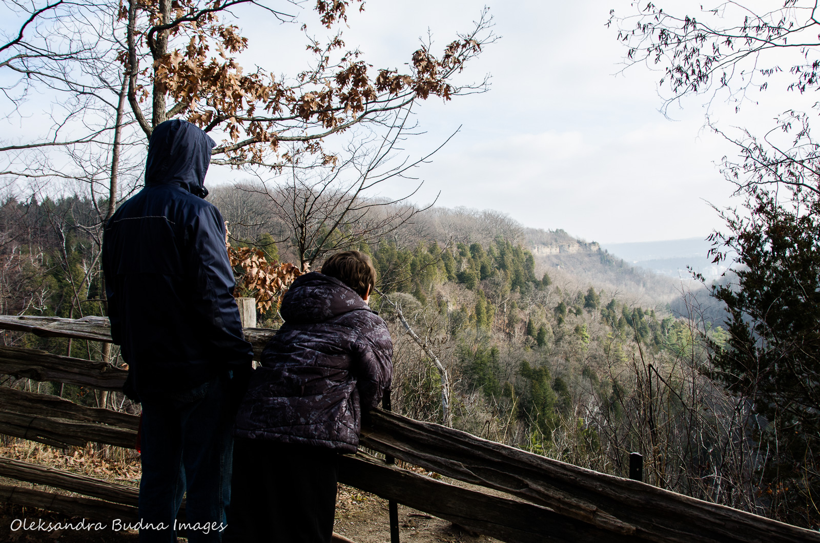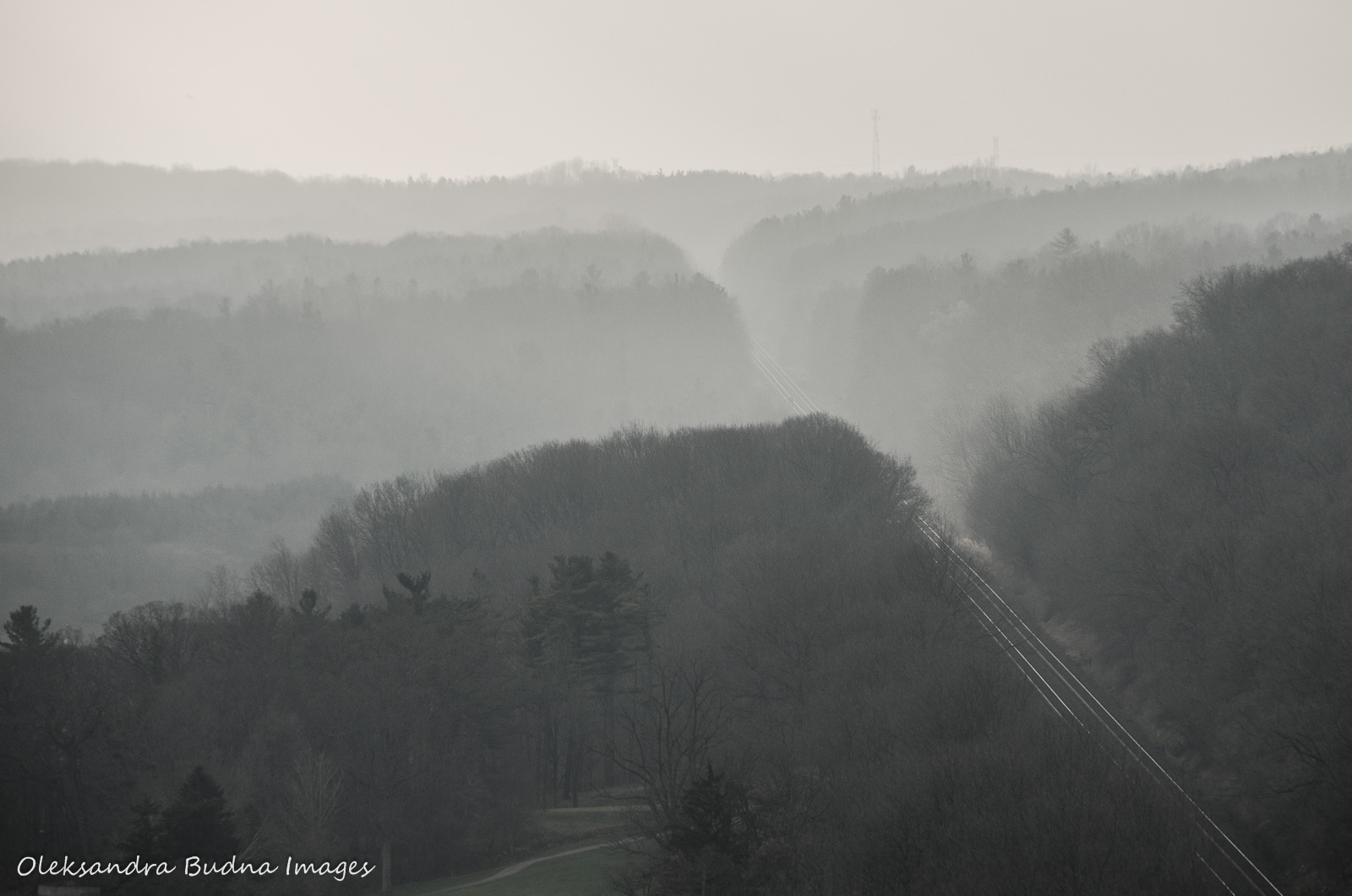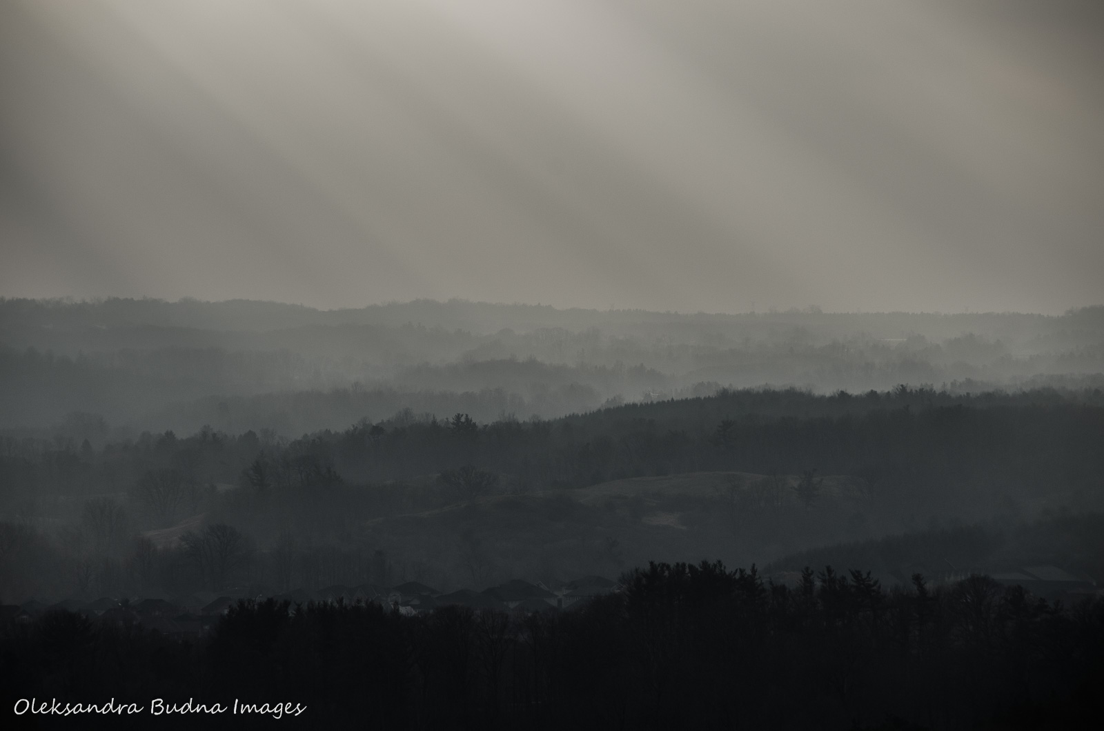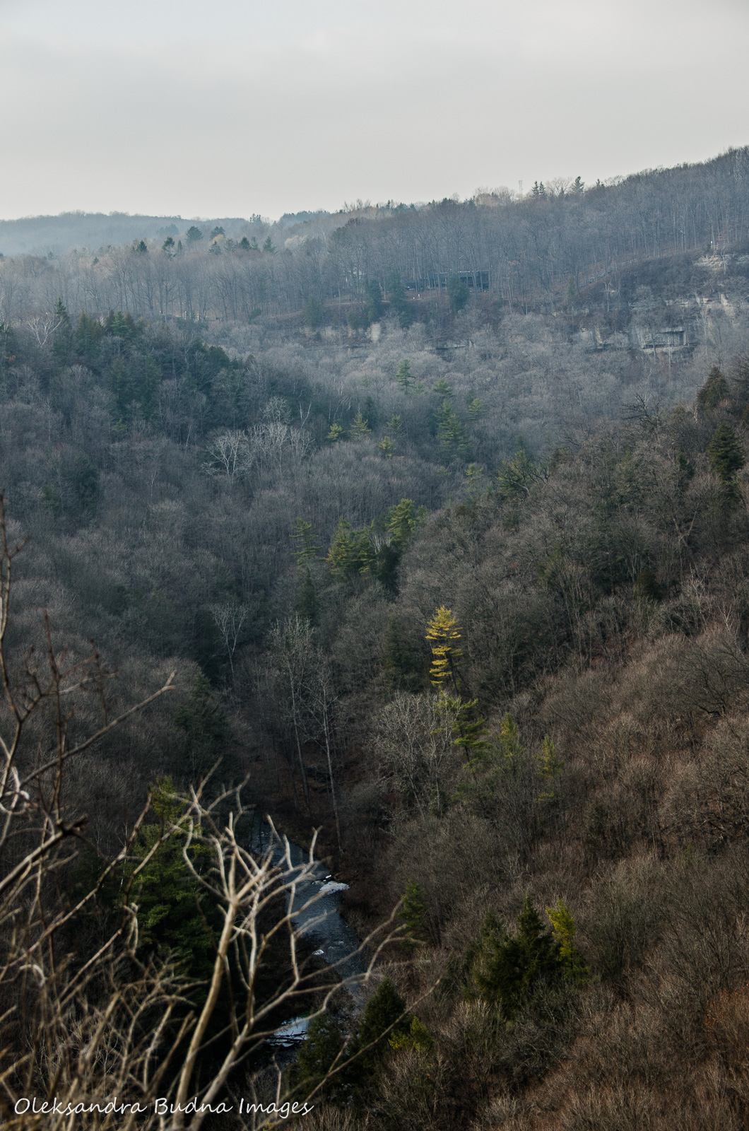 Dundas Peak was our next stop along the trail. Once we reached it, we were treated to well-ordered, checkerboard views of Dundas to one side and rugged Spencer Gorge on the other. Apparently, on a clear day you can see as far as Stoney Creek and Hamilton Harbour. It wasn’t one of those days. However, sunlight streaming though the clouds and misty hills in the distance made for some beautiful pictures.