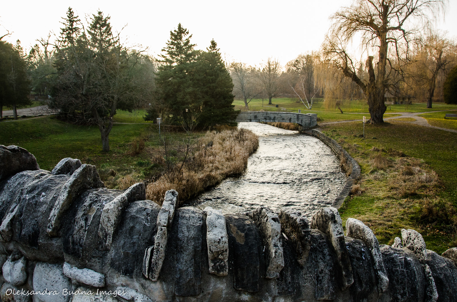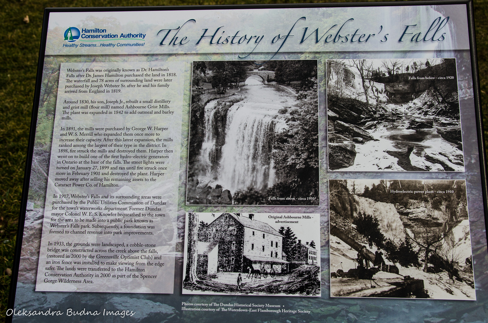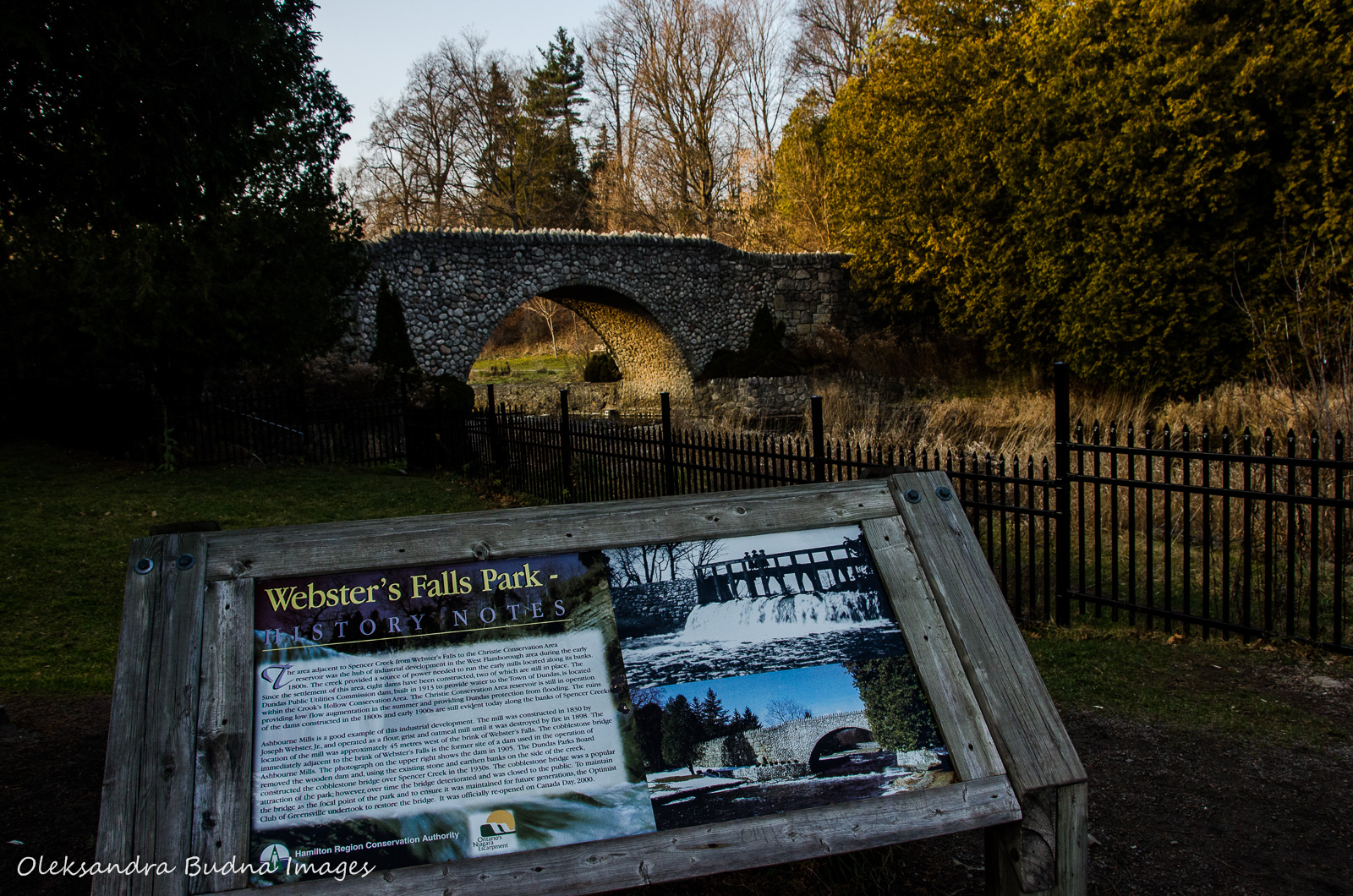 Once we returned to Webster’s Falls, we made our way to the other side of the waterfalls. While not as tall as Tew’s Falls, Webster’s Falls is much wider and is the largest and most famous in the region. The park around Webster’s Falls is designed as an English country landscape with low stone walls along Spencer Creek and a famous arched cobblestone bridge. There are a few information panels explaining the history of the region since it was purchased first by Dr. James Hamilton, then Joseph Webster Sr. (when the Falls was renamed from Dr.Hamilton’s to Webster’s) and a bunch of other wealthy guys. Over time, the area was used as a site for a distillery, all sorts of mills, one of the first hydro-electric generators in Ontario until it was purchased by the town of Dundas in 1917 and became a public park shortly after. We couldn’t find any information about the pre-industrialized history of the falls or what its name had been before rich owners started naming it after themselves.