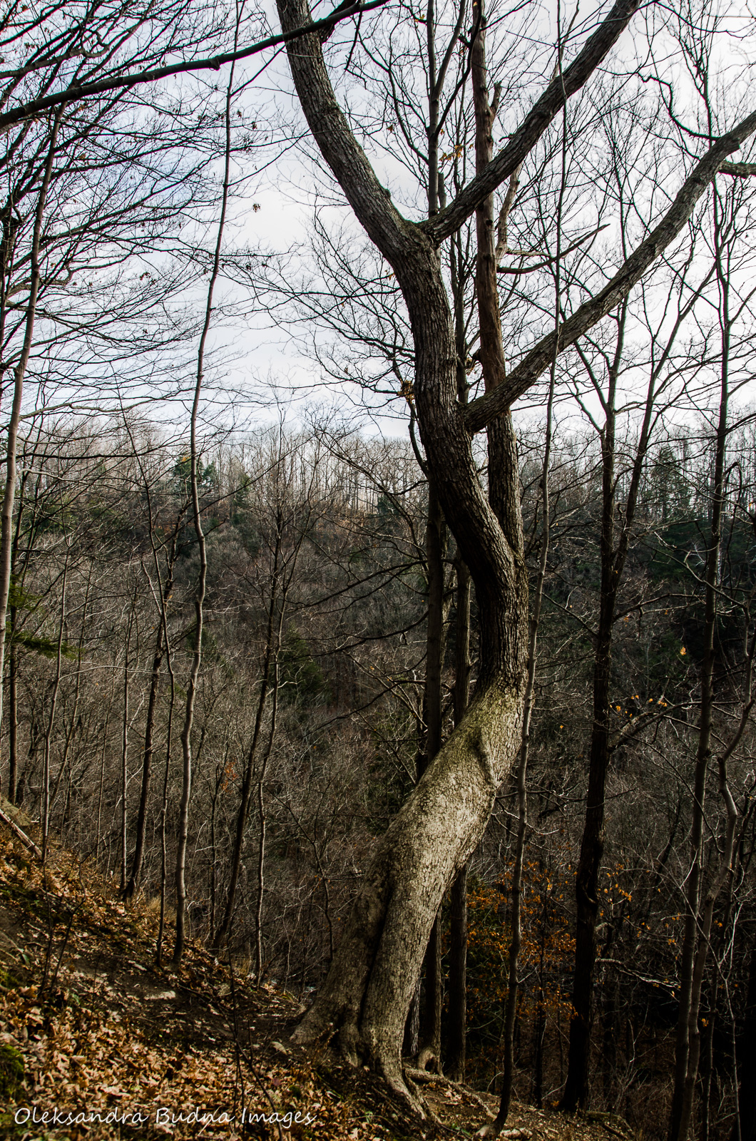 The distance from Webster’s Falls to Dundas Peak is about two kilometres one way. The trail has a couple of staircases to climb but for the most part is pretty flat and easy with Dundas Peak visible across Spencer Gorge and Spencer Creek down below. I know most people would prefer the deep greenery of summer or the colourful glamour of fall to the monochromatic landscape of December. To me, though, the leafless forest speaks of solitude and quietness. I can hear those bare trees whisper of winter slumber and potential for rebirth in the spring.