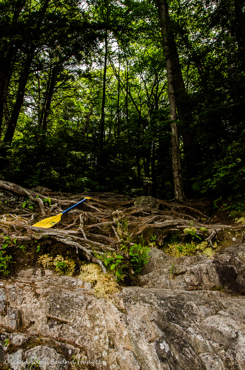 To get to the Crack, I had to paddle to the end of Terry Lake (5 minutes), portage into Kakakise Lake (860 metres), paddle across Kakakise (about an hour) and then hike to the top (about 40 minutes). Portage was longish but not too hard once I figured out how to carry my day pack, camera, paddle, life jacket and canoe all in one go. The trail was dry and relatively mosquito-free but judging by the boardwalks in the middle, it probably gets muddy and buggy when it rains. There was a bit of an ascent at the end of the portage closer to Kakakise, which was even more difficult to tackle on the way down, when a canoe is harder to balance and keeps scratching the ground at the back. The last bit of it over roots and rocks was particularly challenging but doable.