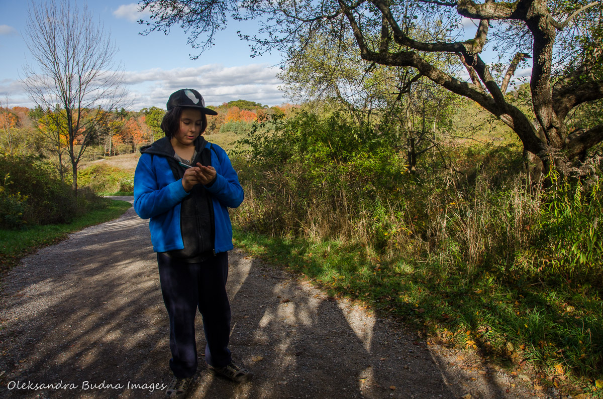 I always enjoy her company on the trail (and away from it as well) because her deep insights, keen sense of beauty and infinite fascination with the world provide a new look at things and inspire some interesting conversations. So as the trail dipped down and climbed back up over the hills and along the Escarpment, we talked about spirituality and religion, linguistic matters, Indigenous history of the area, and, inevitably, the election south of the border. After each encounter with a dog, our older son tried to (unsuccessfully) convince our friend that dogs were fun. While the younger one kept searching for geocaches especially for her since the hike happened right after her birthday. He had his sights set on 20 but could locate only five, which, according to our friend, was a perfect amount. She also noted that her idea of geocaching would involve caches hidden at the bottom of a latte rather than a hole in a tree. I guess she remains a city girl at heart, albeit with deep appreciation for nature.