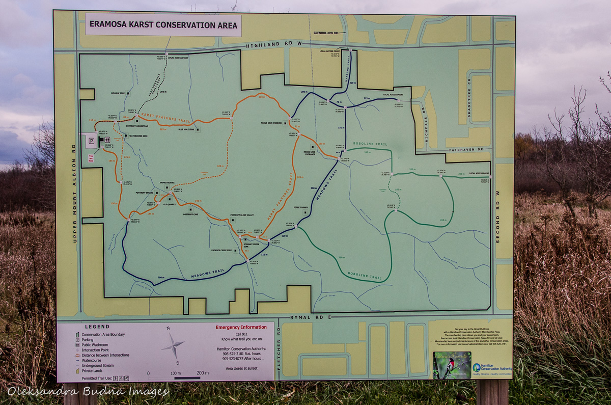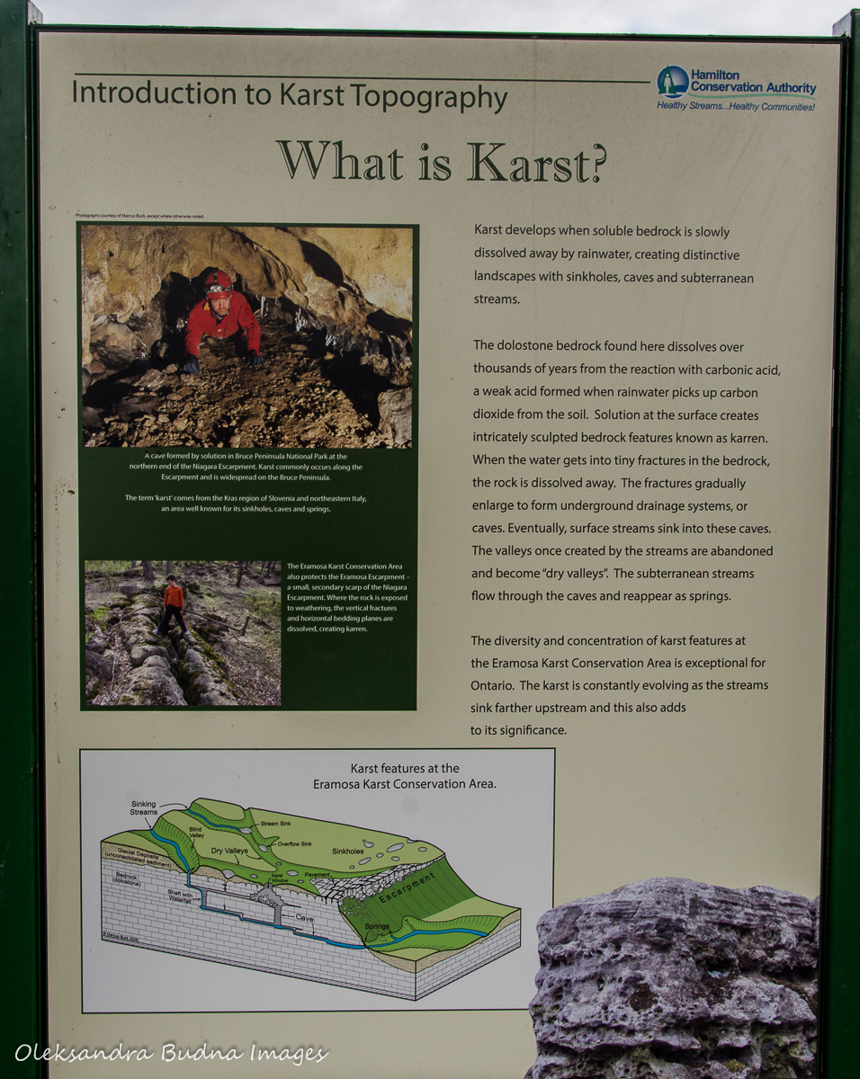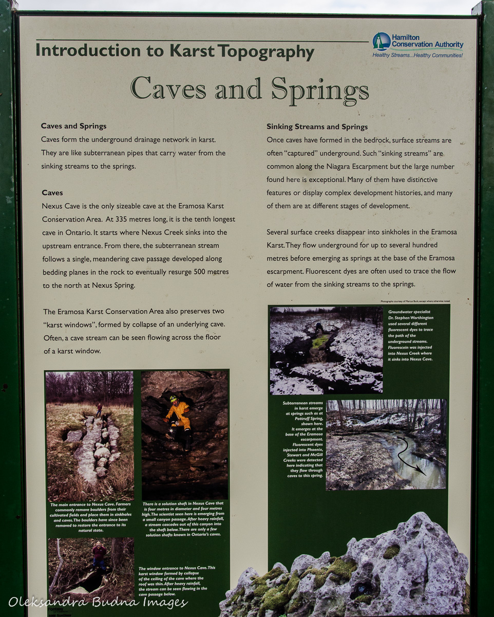For our adventure we chose a place with a beautiful and mysterious name Eramosa Karst. Located in Stoney Creek in the traditional territory of the Haudensaunee and Anishnaabeg, this park is the newest addition to Hamilton Conservation Authority. It is fairly small, but has the largest number of unique karst features in any single area in the province.