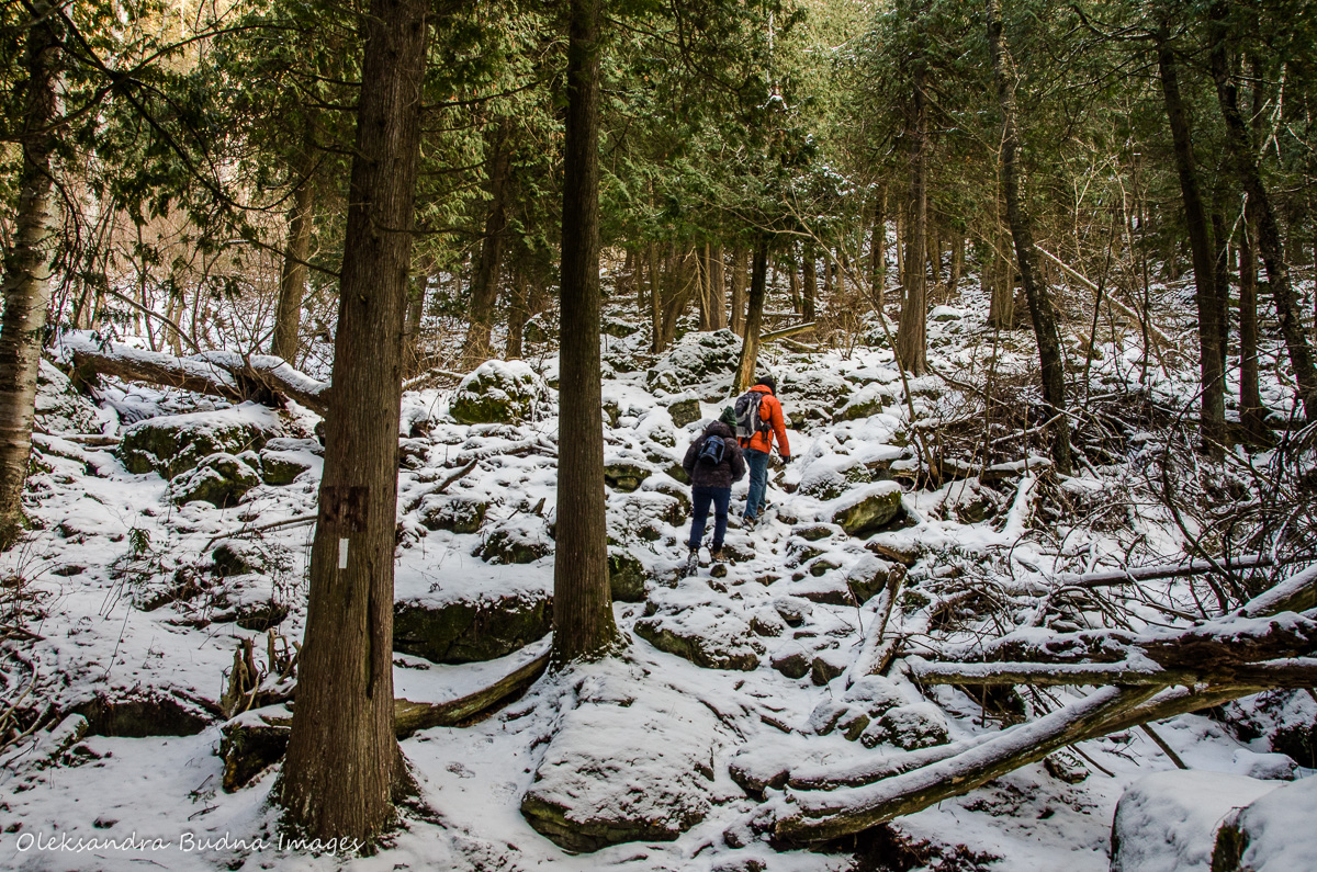 It was a beautiful winter day. The temperatures were hovering around zero so it was pretty warm, and after a week of snowing there was a thick white blanket all around. With all the snow, the trail wasn’t always obvious. Luckily, the Bruce Trail system is very well marked so we just followed the white and blue markers.