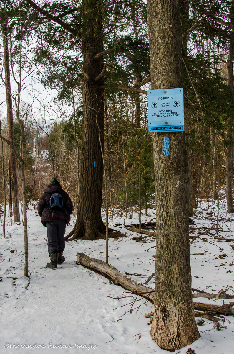 This time we decided to explore the Bruce Trail in the other direction – from the information panel near Fallbrook Trail to 10th Line, and the Roberts Side Trail. We had six geocaches on our list but ended up finding only four, not a bad number considering digging for them in the snow can sometimes be tricky.
