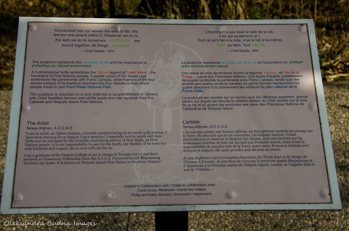 This work is on display at Point Pelee. The entrance to the park now features a sculpture by an Ojibwe artist. At the bottom of the sculpture is a quote by Chief Seattle. A reminder that we are all interconnected and are only one strand in the web of life. Something we in the west have long forgotten. But I have hope that we can still remember. A hope that rebirth and rejuvenation is possible.
