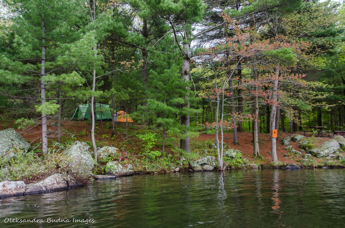 Frontenac, located just north of Kingston in the traditional Algonquin territory, is a backcountry park only, i.e. there is no car camping available. However, many of the sites in Frontenac are fairly close so we could take it easy on our first backcountry trip of the year. We booked a site in cluster 4 on Big Salmon Lake, which was only an hour paddle or a two-hour hike away. That turned out pretty helpful since I was fighting a nasty virus complete with congestion, lots of snot and painful cough and don’t think I’d be able to handle anything more strenuous (to think of it, I was sick last year too; looks like it’s becoming a new May long weekend tradition).