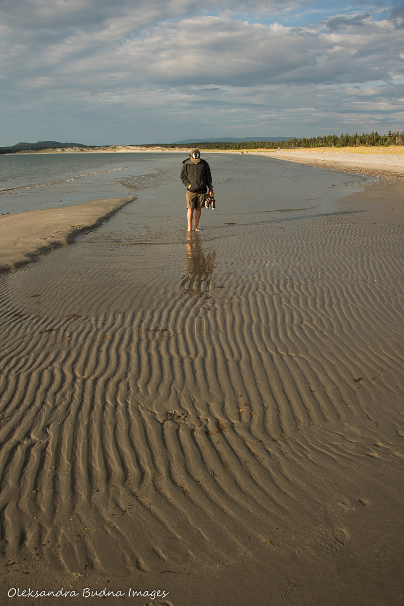 Our next stop is the day use area near the Shallow Bay campground where we make late lunch/early dinner. The main goal, however, is a geocache along the Old Mail Road. We find more than a cache there. The trail seems to be the central gathering point for all of Gros Morne mosquitoes. There is more jogging. My calves are now in full protest mode. We push through a mosquito cloud and find ourselves on a beautiful sandy beach. Seems like a much better way to get back to the car.