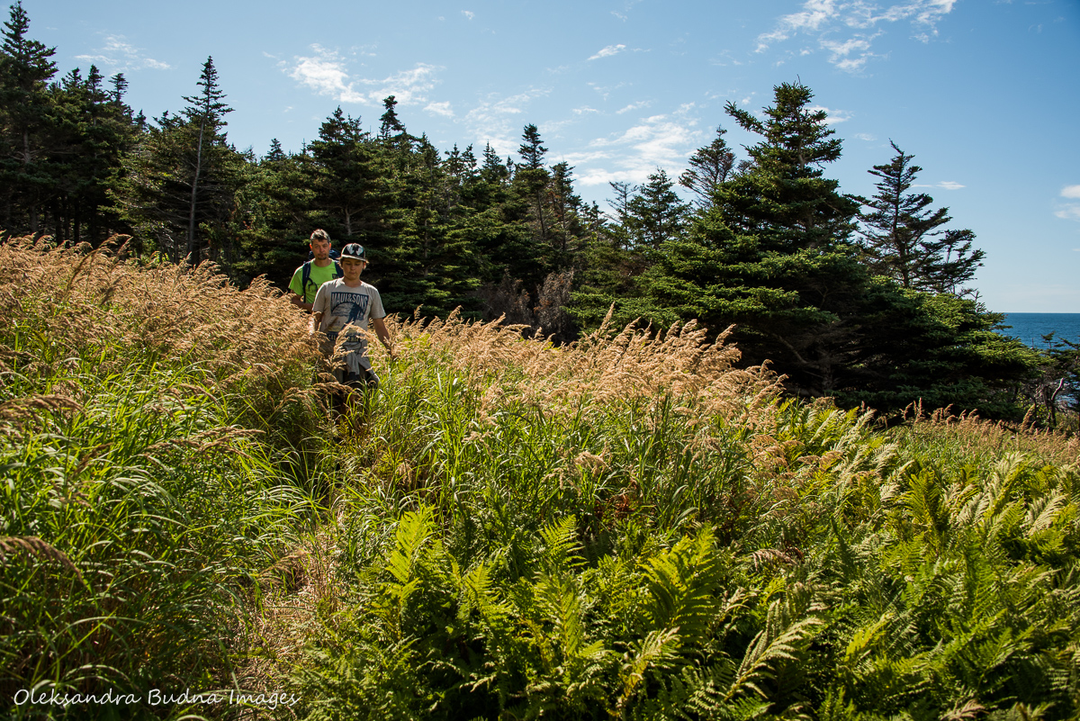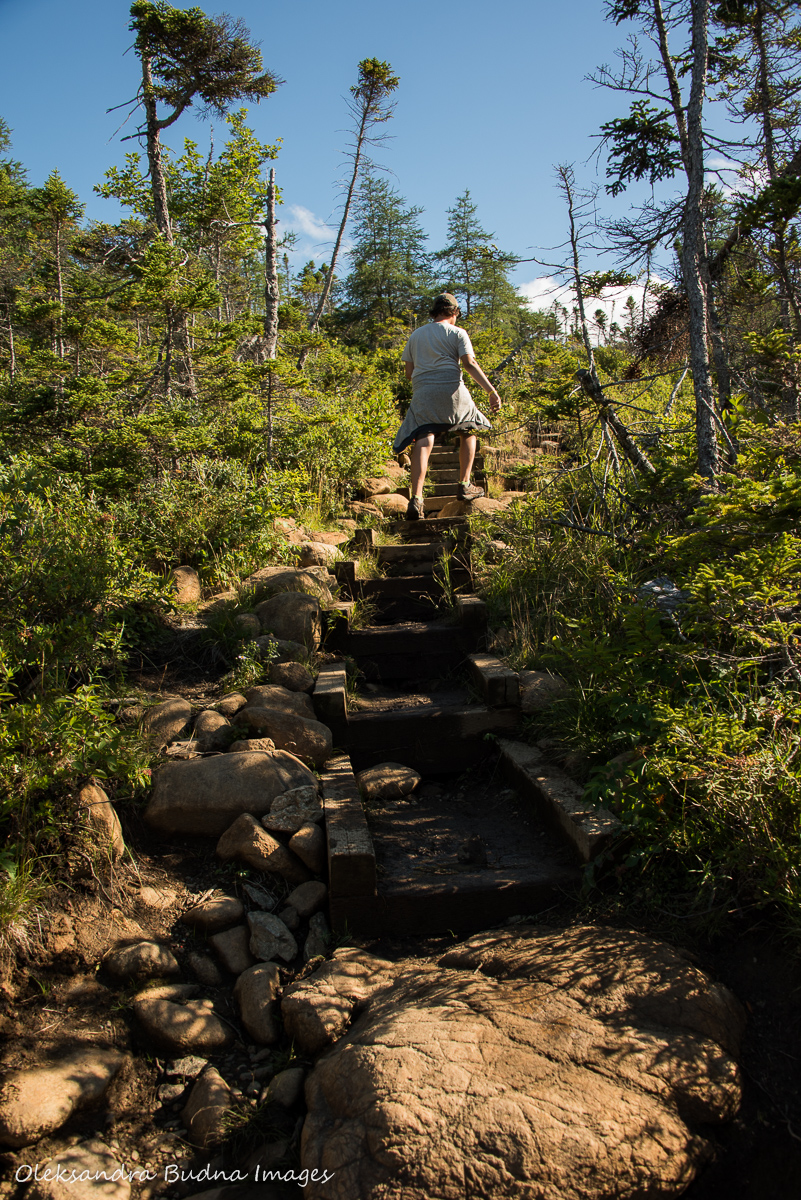 We start with wading through water across mostly bare terrain but it quickly transforms into a tuckamore forest as we start going down towards the ocean. There are endless sets of stairs and I try not to think about how much climbing up we’ll have to do on the way back.