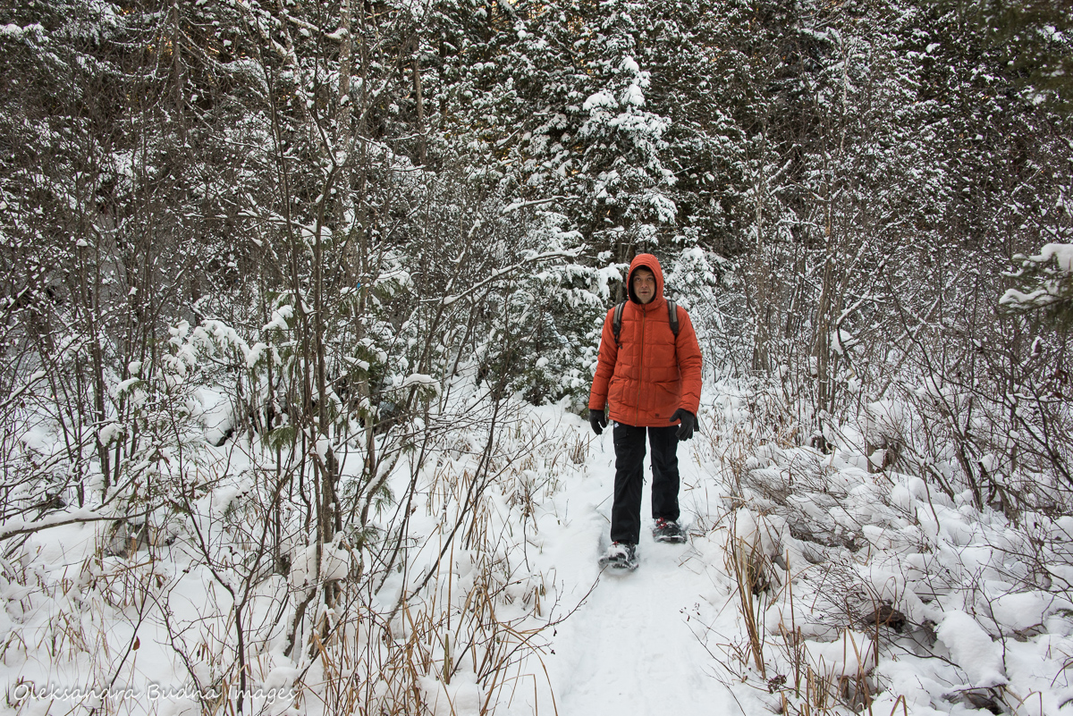 We only had one full day at Silent Lake and we couldn’t wait to venture into the woods. Our snowshoes were also happy to finally hit the trails and taste some snow. Bonnie’s Pond Trail, which starts right next to the Pincer Bay campground where we stayed, seemed like an excellent choice for our outing. At three kilometres (a little longer if you count the side trail to the lookout), it is not particularly long but with snow and snowshoes on, plus all the stops to take photos, it took us over two hours.