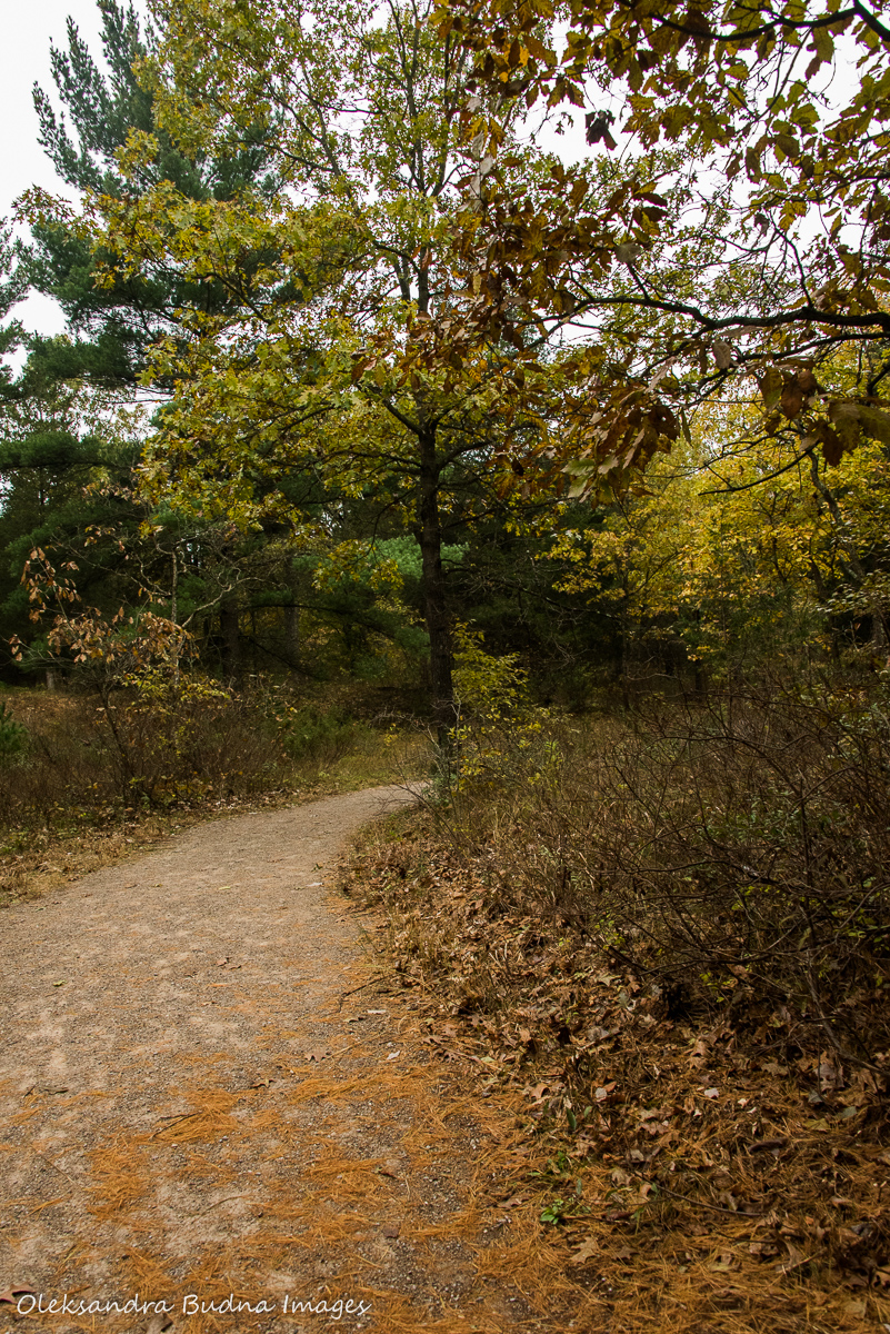 I turned onto the Cedar Trail. Our feet pounded this path many times before but as I was walking through the oak savanna that morning, I realized we’d never been there in the fall. Plenty of times we walked through the lush greenery of the summer and a few times through early winter’s fragile bareness but never under the canopy of yellows and bronze. I’ve always associated Pinery with the summer. In one of my posts, I actually said that’s where the summer lives. But on that morning, I saw it in a new light, quite literally, and fell in love with the park all over again.