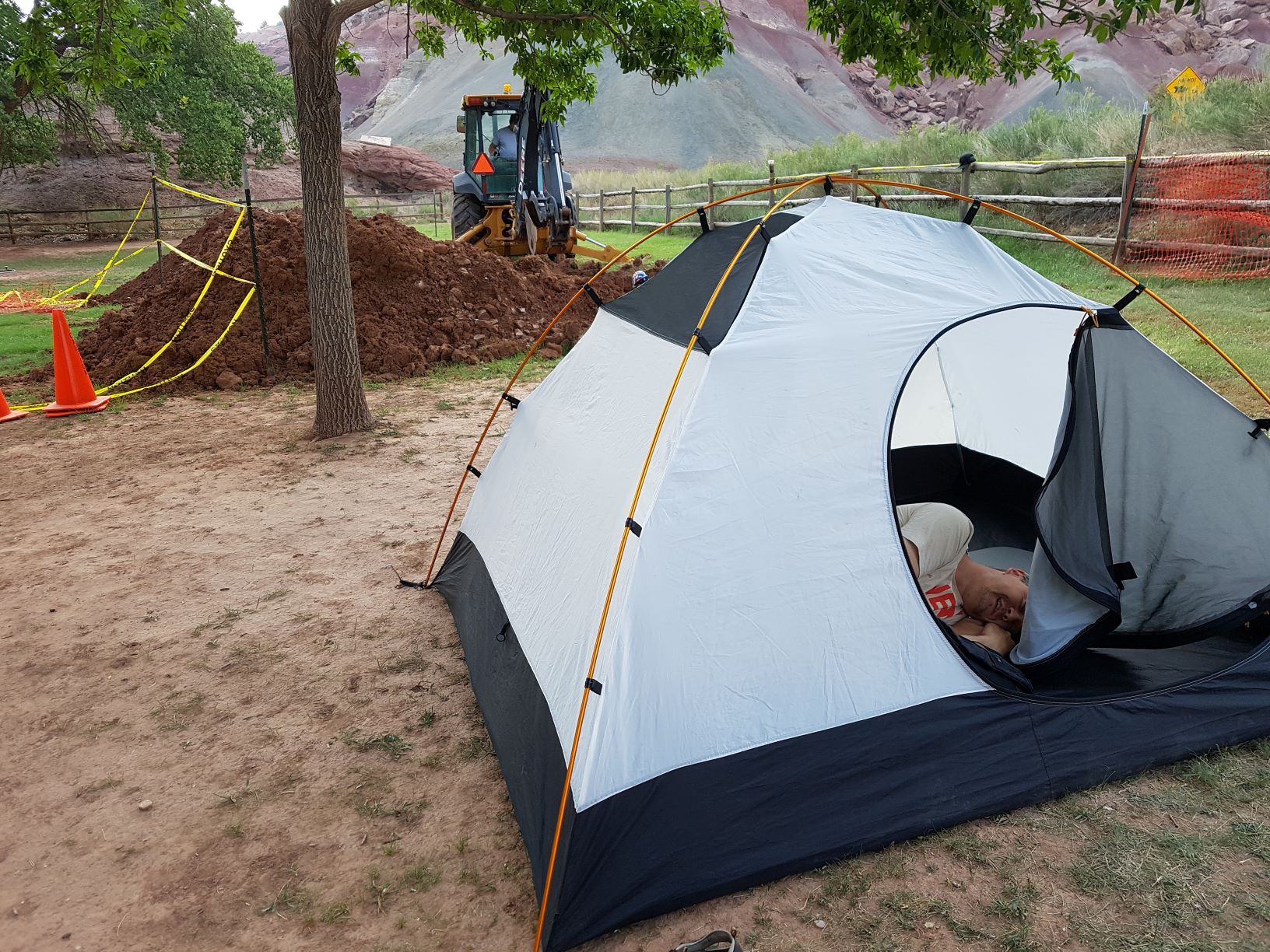 During our road trip, we were looking to break up our drive from Dead Horse Point to Zion so we booked a campsite at Capitol Reef. The campsite was a walk-in, which was promising. What we couldn’t predict was ending up right by some repair works. In addition to a magnificent red rock, our backdrop also featured an excavator and a large hole in the ground. The worst part was when the excavator sprang to life at 7 a.m. the next morning so we had to get up whether we wanted to or not. We quickly packed and moved to a day-use area to make breakfast. Pies from the park store sweetened the disappointment.