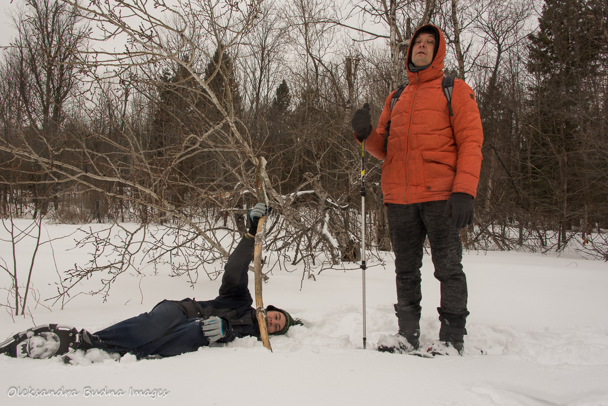 So this time we were hoping to visit it in the winter. Equipped with lots of snacks, tea and unwavering resolve not to turn back no matter what, we set out on our expedition. At a little over four kilometres one way, it’s not a long trail but can be a bit challenging in the winter, especially with all the snow this year. We measured it at one point and our walking stick went almost all the way in.