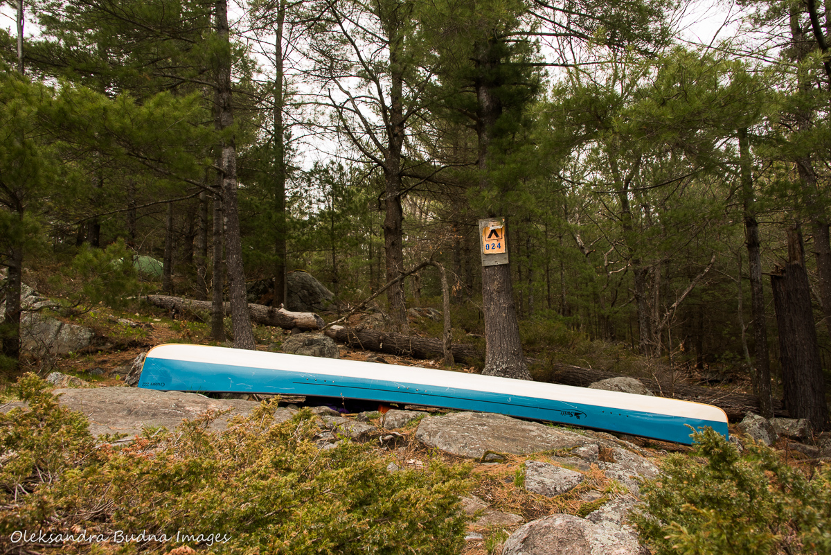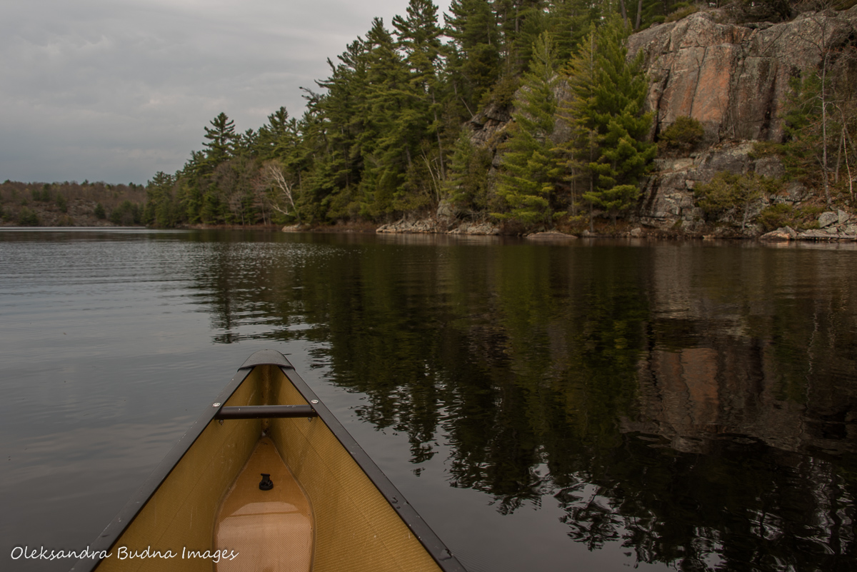 The May long weekend made us sweat. Not literally – the weather was a bit on a cool side, actually, with generous helpings of rain. But the run-up to the weekend was marked with uncertainty and seemingly endless waiting as spring refused to show up and the late ice out kept pushing back the park opening date. Till about a couple of weeks before the trip it wasn’t clear whether we’d need to turn our canoe into an icebreaker. In the end, spring decided to grace us with her presence, albeit reluctantly, melting the remainder of ice, along with our worries, and the trip was a go.