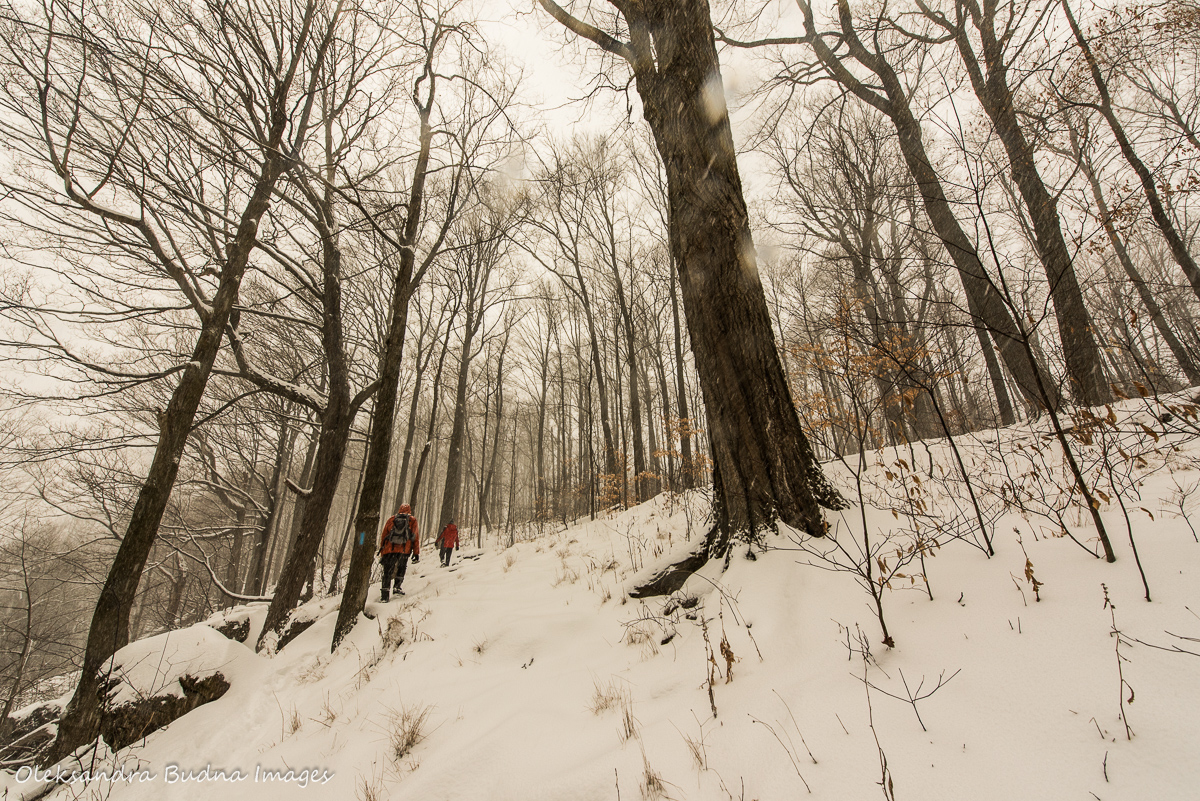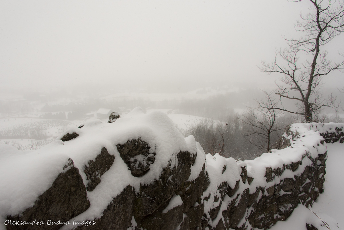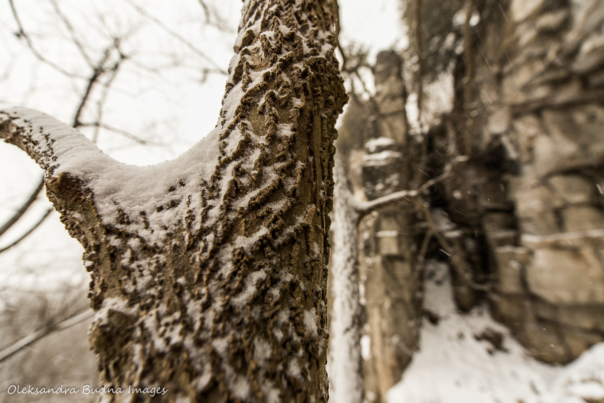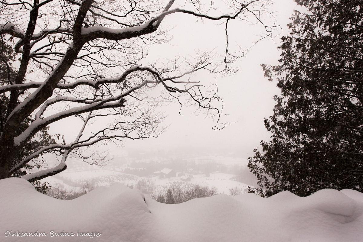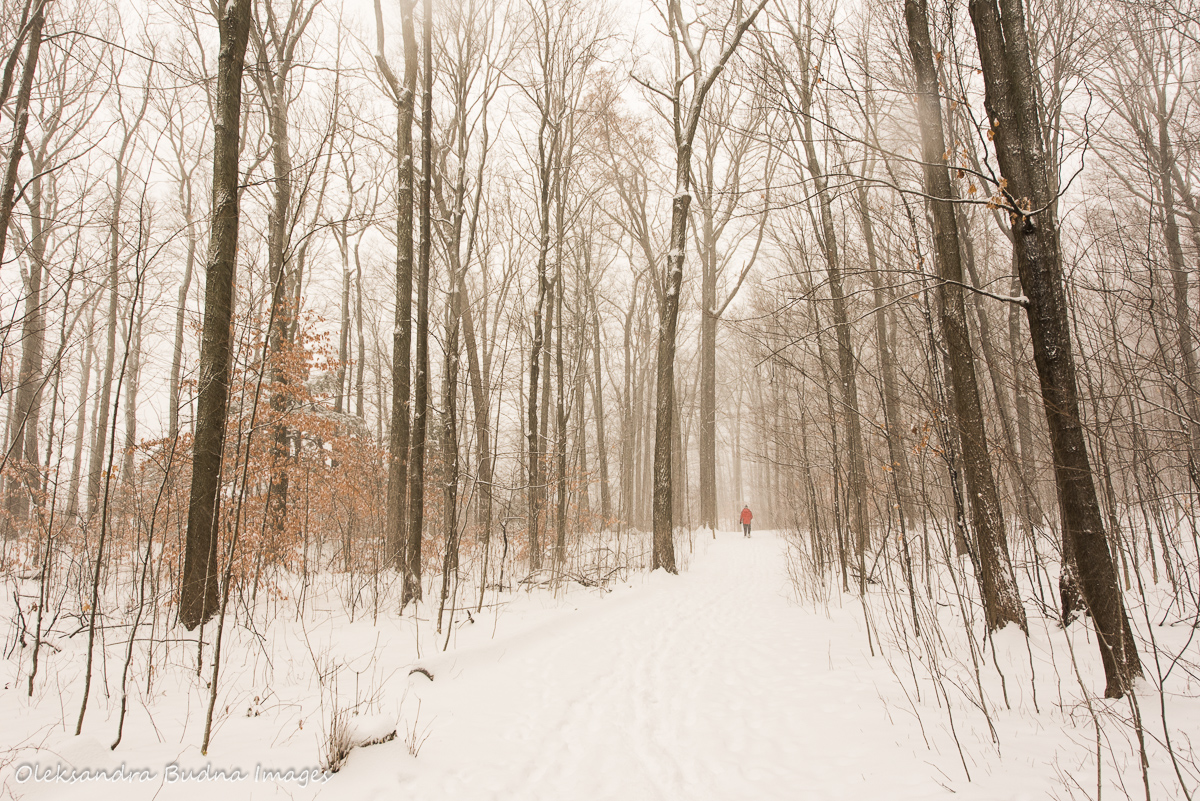 By the time we arrived in the park, the world was wrapped in a thick cover of snow, hiding its own greyness under fluffy layers. We walked through the whiteness, punctuated by tree trunks with an occasional colourful burst of trail markers or the copper of ironwood leaves. The forest on the other side of Nassagaweya Canyon was nothing but a faint outline.