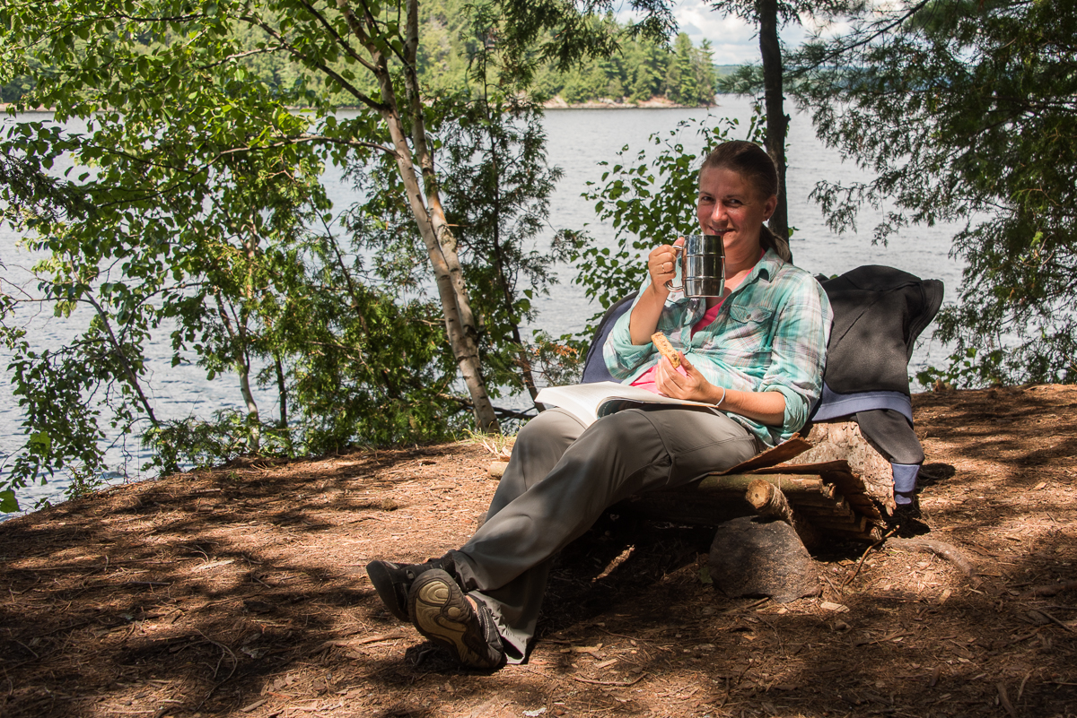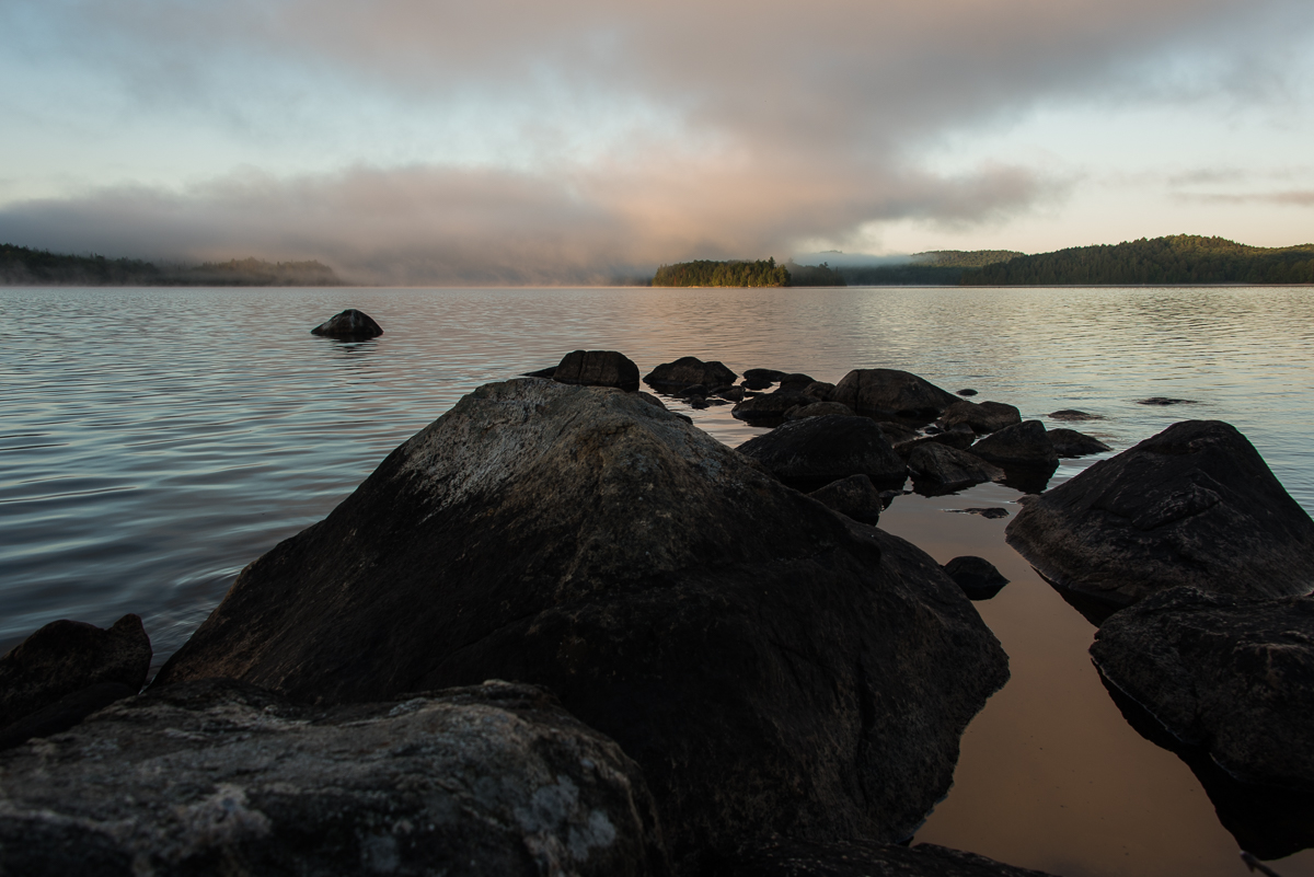 North Tea Lake, named so for the colour of the water I guess, has a lot of campsites with sandy beaches, especially on its western part. We knew there were a couple of them on Manitou Lake and even considered going for one but in the end I picked rocks. A good campsite has several key features: a flat(ish) tent pad, a nice view from the campfire, decent swimming, good access to water and firewood, western or southern exposure to enjoy more natural light in the evening, but none is more important than rock outcrops. They serve so many purposes: a place to read, enjoy a cup of morning coffee or evening tea, a front-row seat for watching the light shows unfolding across the sky every night, and, of course, a foreground for pictures.