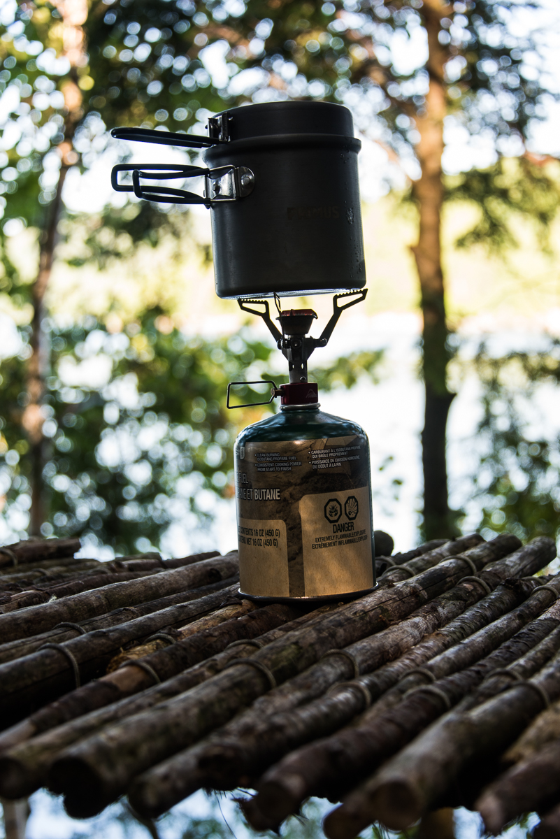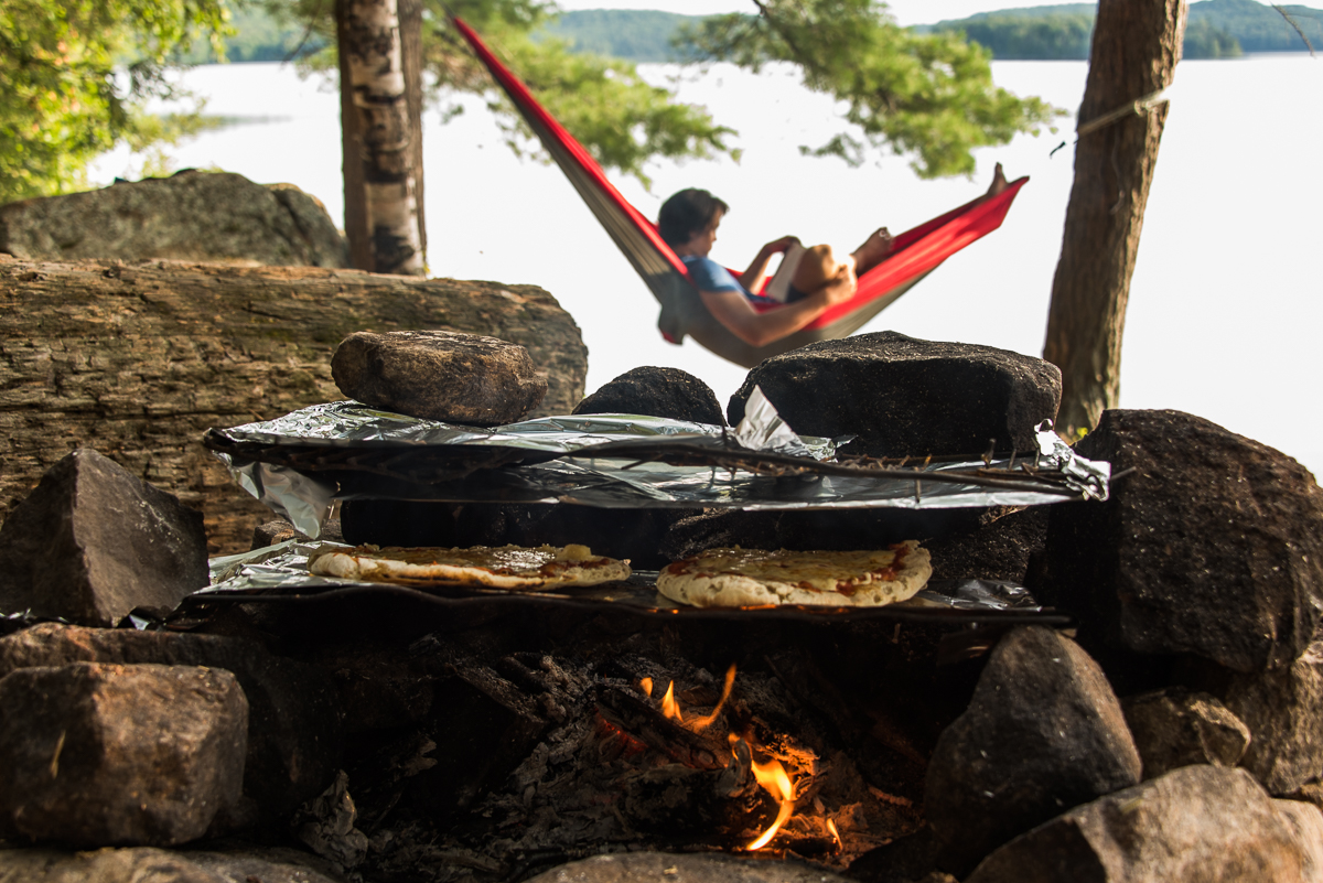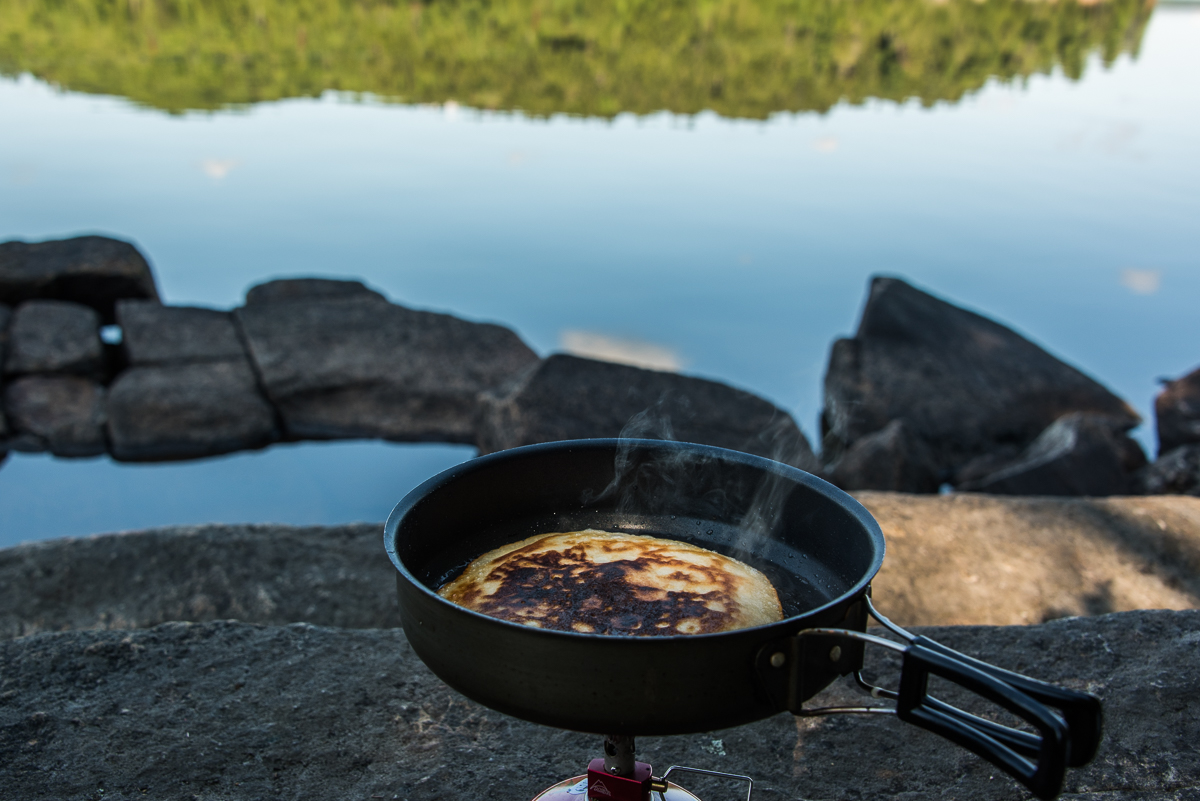 By the time we arrived on North Tea Lake, the wind picked up speed so we didn’t get far. We ended up on the first island lured by its beautiful rock ledge. Turned out rock outcrops might not be the key consideration when trying to pick a site during a storm. The site was too open so even setting up a tarp or starting the fire was challenging. Eventually, after a cup of tea, we hopped back into our canoe and move to another site on the shore. It was the best decision we made that day. The site was sheltered from the wind, had some great seating around the campfire, and was well stocked with pre-cut wood (big thanks to its previous visitors). We even had our own tiny beach, which we didn’t get a chance to use. We quickly got the fire going and started making dinner slowly warming up inside and out.
