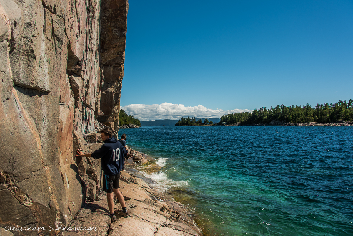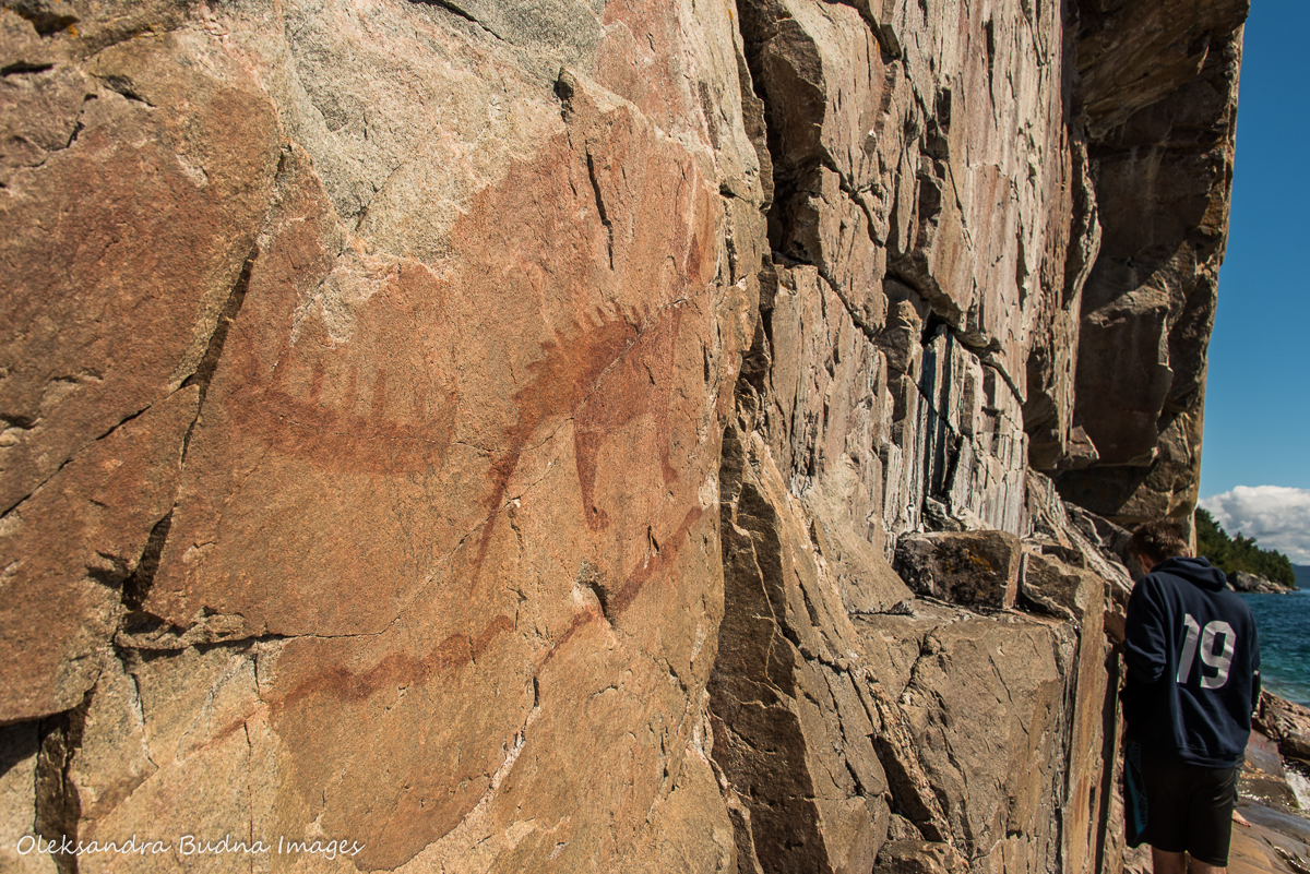 Ojibwe believe Mishipeshu, the Great Lynx or Water Panther, is responsible for these sudden changes in Gi chi Gamiing’s demeanour. When angered, this horned lake monster thrashes his tail and creates dangerous waves making the waters impassable. One of the most famous depictions of this creature can be seen on the Mazhenaubikiniguning Augawong (Inscription Rock), now more commonly known as Agawa Rock. This 100-foot-tall rock face features dozens of ochre pictographs – multiple images of canoes, bears, turtles, snakes, suns, serpents, all telling stories of Anishinaabe people who have called this area home for tens of thousands of years. While one of the most accessible pictograph sites in Canada, the sloping ledge at the bottom of the rock can be quite a challenge, even dangerous on a stormy day.