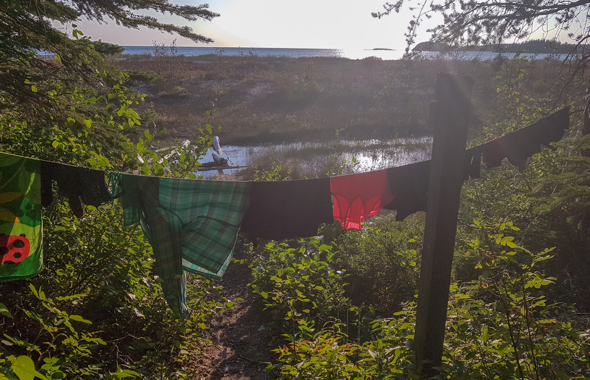 Pukaskwa National Park is located at the edge of Gi chi Gamiing, the world’s largest freshwater lake by surface area, on the traditional territory of Anishinaabe people who have been living here since time immemorial and have deep connections to this land. It is the longest undeveloped stretch of the Lake Superior coast. The Coastal Hiking Trail can only be accessed on foot or, in some places, by boat, and, unlike other backpacking trails, it has very few markers to point the way. Except for cairns along its rocky stretches and an occasional yellow bucket or green toy hat to indicate where the trail turns inland, it is an unmarked path that winds through boreal forest, over rushing rivers and meandering streams, across two suspension bridges, along endless sandy beaches, treacherous fields of cobblestones and rugged rocky landscapes. As a ranger explained to us during our orientation session before the Mdaabii Miikna hike last year, “you have to use your trail sense.” After a couple of days on the trail, we start to understand what it means. We learn to read it, recognize where hiking boots have passed before us, even on the rocky surfaces that don’t give away too much information.