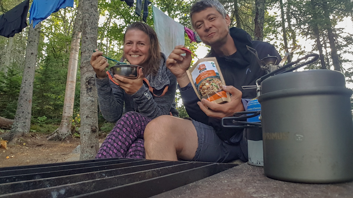 After that, all we had to do was hike 14 kilometres back to our campsite. We walked onto the White Gravel River beach, hungry and exhausted, right after the sun dipped into the lake. There was just enough light left to make and eat dinner. As we sat on a log watching much calmer waters, it dawned on us that we were officially past the halfway point of our hike.