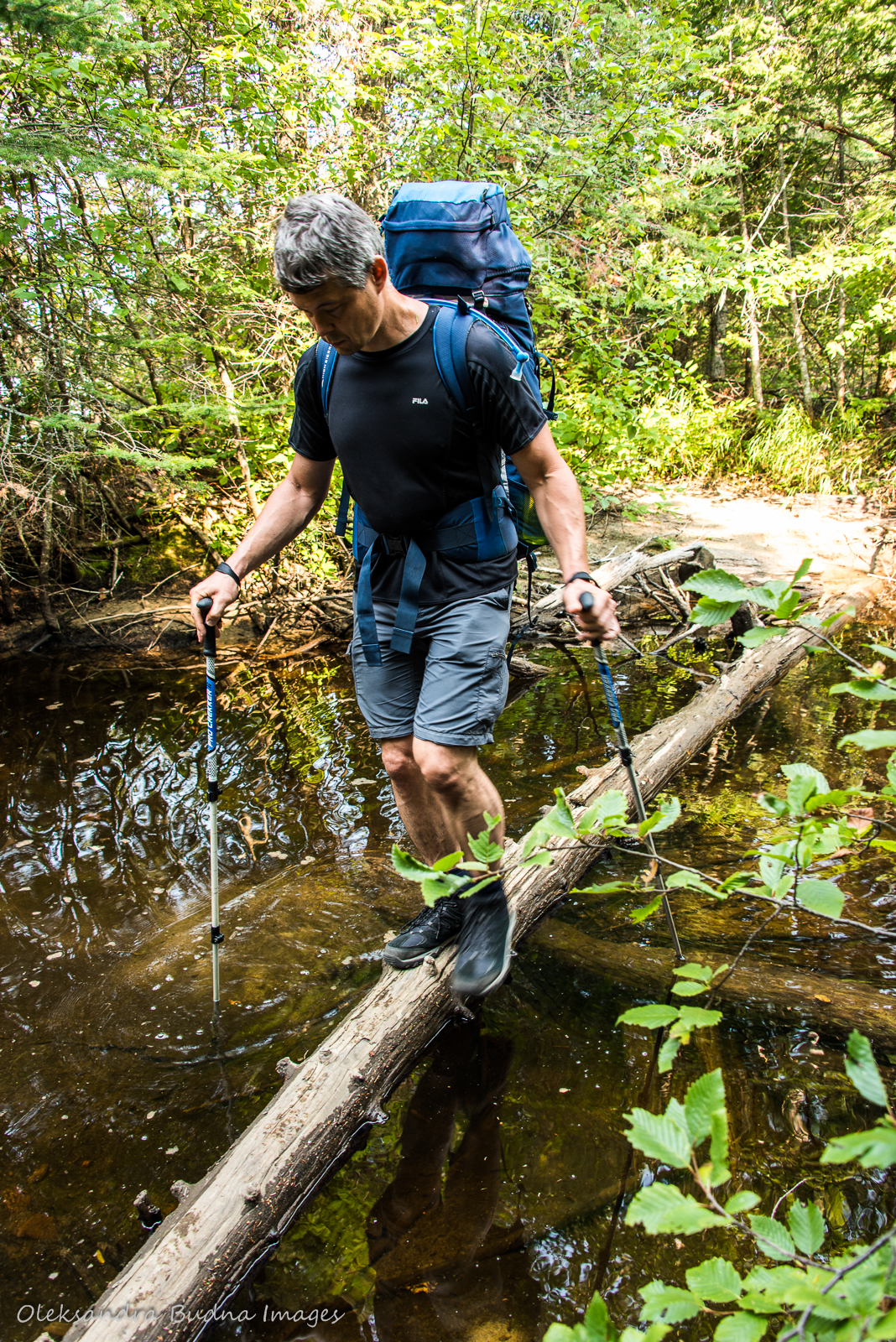 Even though our hike was significantly shorter that day, it still took us over four hours. The section between Fisherman’s Cove and White Gravel River is a steady climb through the woods to the highest point along the trail. Not technically complicated but still time consuming. The biggest obstacles awaited us at the end once we got to White Gravel River. First, we had to cross the above-mentioned river. We didn’t want to get our sandals wet (changing into dry sandals at the end of the day is one of the trail luxuries) so we opted to go barefoot – a slow, not to mention painful, process on gravel and cobblestones. After that, the campsite seemed so close and yet so far away. As we hobbled across the beach, the skies decided to unleash some water. Hard as we tried to walk faster, it was not possible on round and shifting rocks. Stopping for rain jackets seemed counterproductive at this point (we did cover our backpacks to protect the gear) so by the time, we arrived at the campsite, we were soaking wet. By the time we set up our tarp, the rain went: “I was just kidding. I have better things to do.” And just like that it was over. No complaints on our part even if we set up that tarp for nothing.