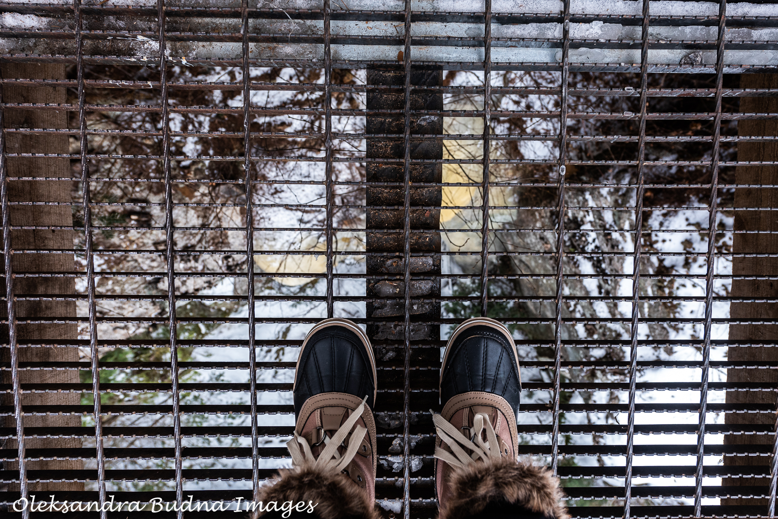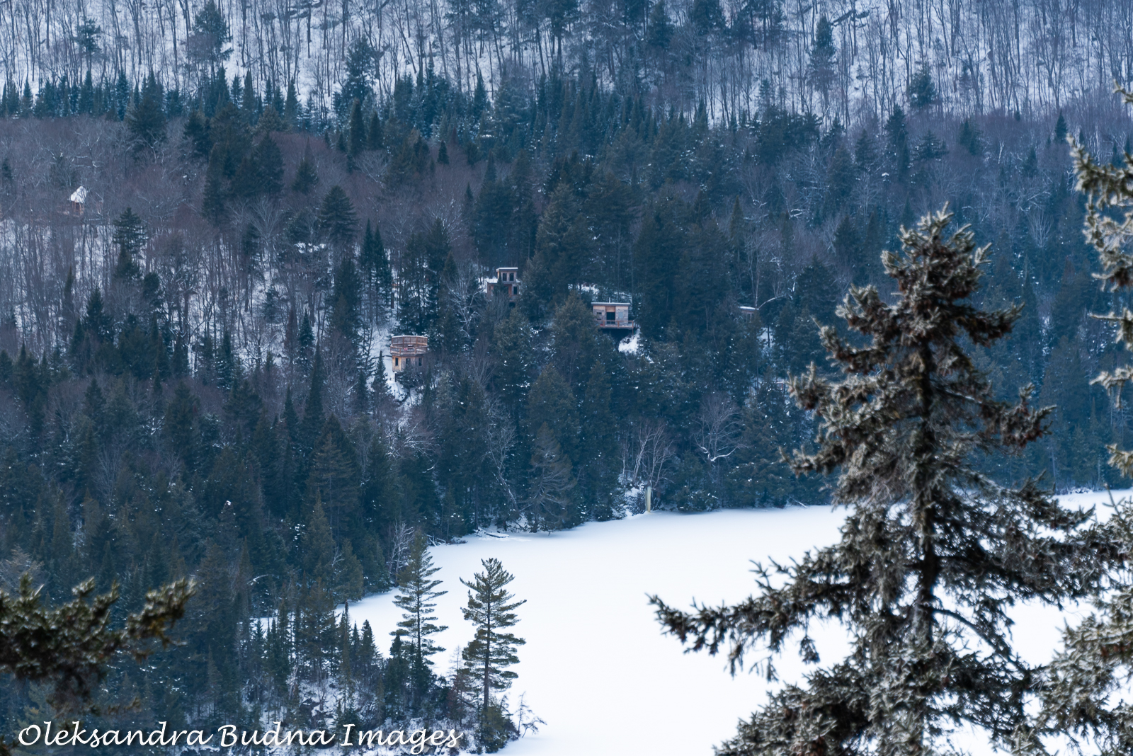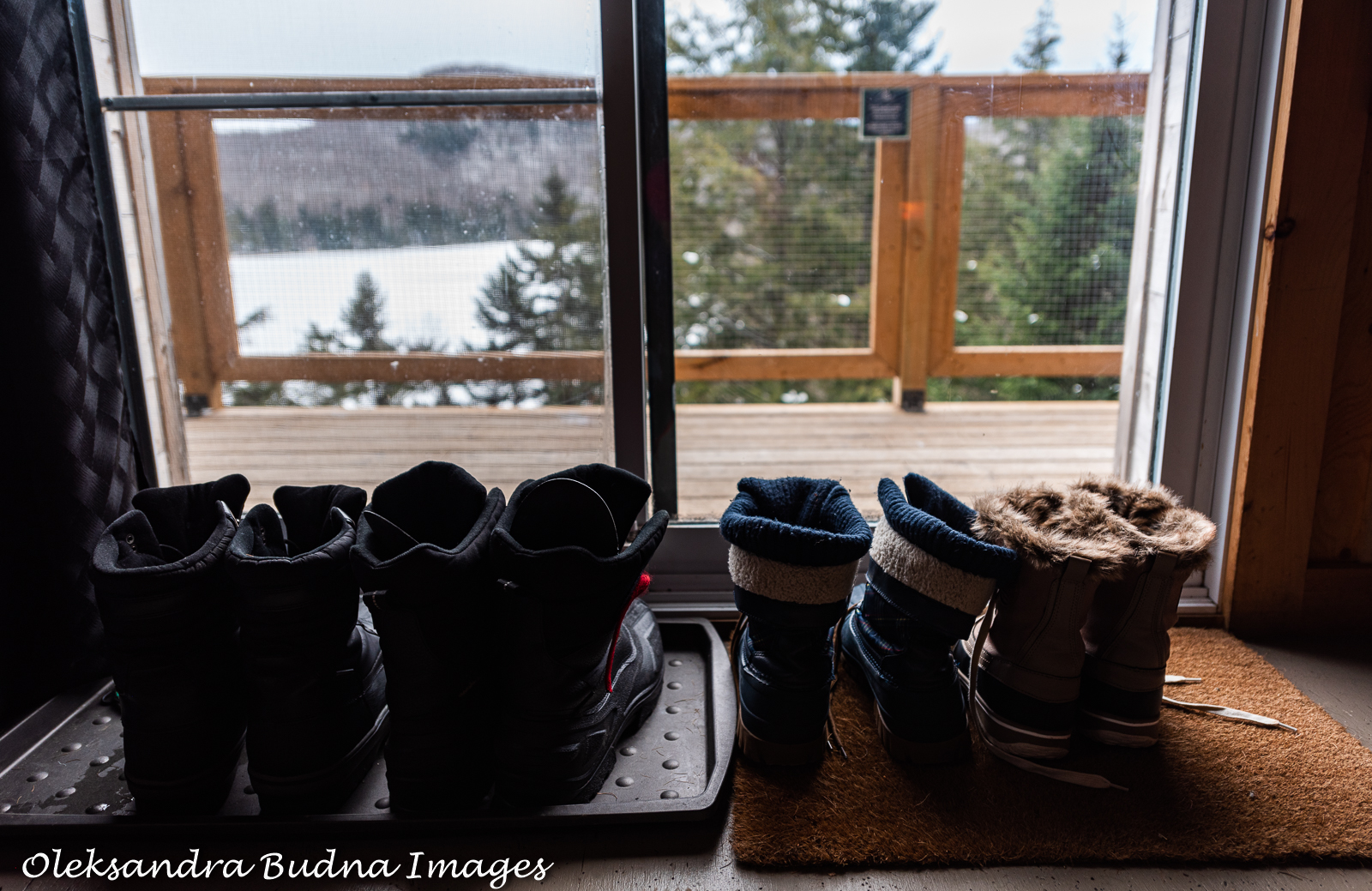 I must confess that I had a hard time choosing a cabin for our stay. As I looked at pictures of hanging bridges, winding stairs, turrets and terraces, balconies and rooftop decks, I wanted to stay in all of them. We finally settled on Cliff House 18 because it seemed to offer the best view. When I clicked the reserve button, I could already picture myself with a cup of coffee on its balcony watching the slopes of the Laurentians rise above the treetops. I wasn’t mistaken: our cliff house did have the best lake vista. Plus, it came with a bonus view underneath. The house truly lived up to the cliff part in its name: through a grate on our balcony we could see it hanging over the edge of a cliff. It reminded me of looking through the CN Tower glass floor, except the CN Tower doesn’t have a frozen waterfall right underneath so our cliff house definitely won view-wise. Every morning, as I stepped outside our door, I would catch a glimpse of ice clinging to the rock wall and feel the thrill of walking over nothingness.