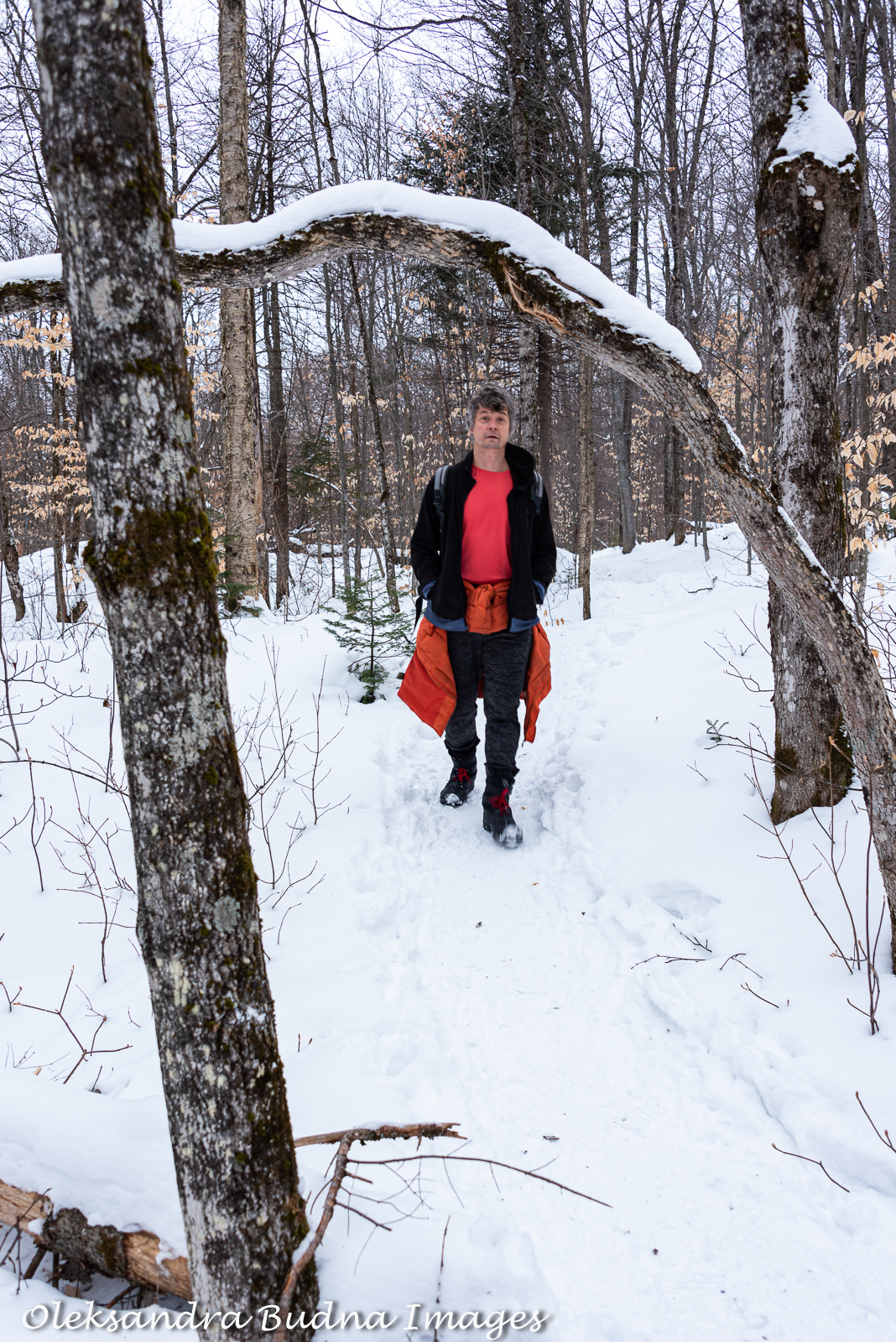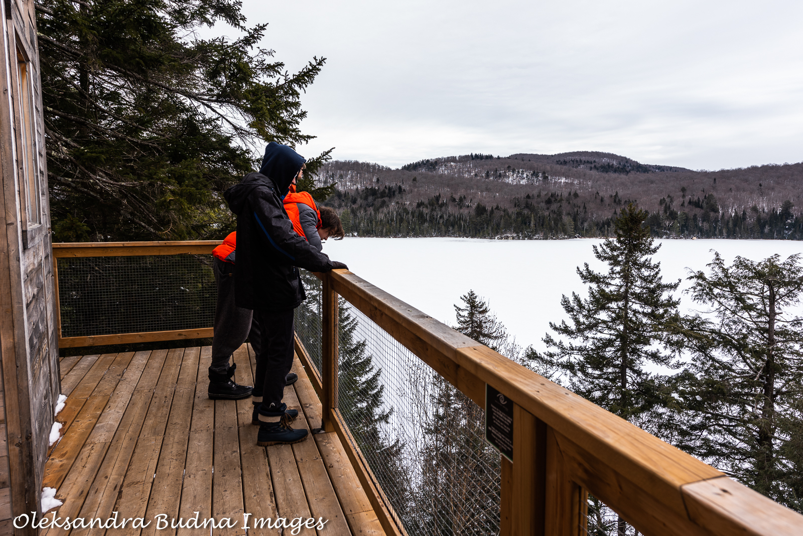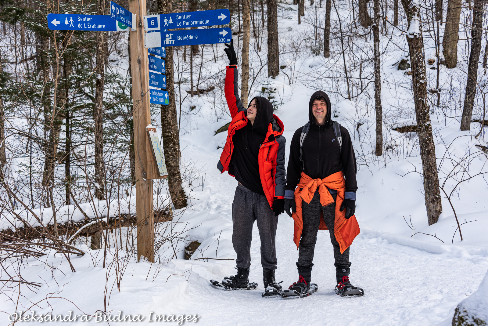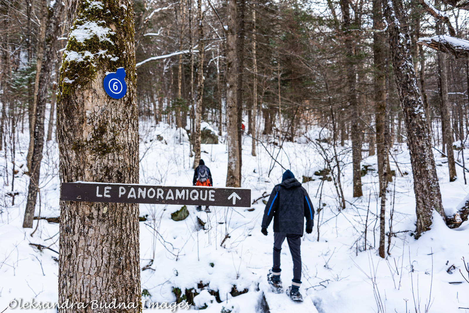 We roamed the park’s many trails. We snowshoed Le Panoramique trail – a short but vigorous climb to a lookout that offered a captivating view of the Laurentian Mountains and a rare glimpse of the blue sky peeking through the grey shield.