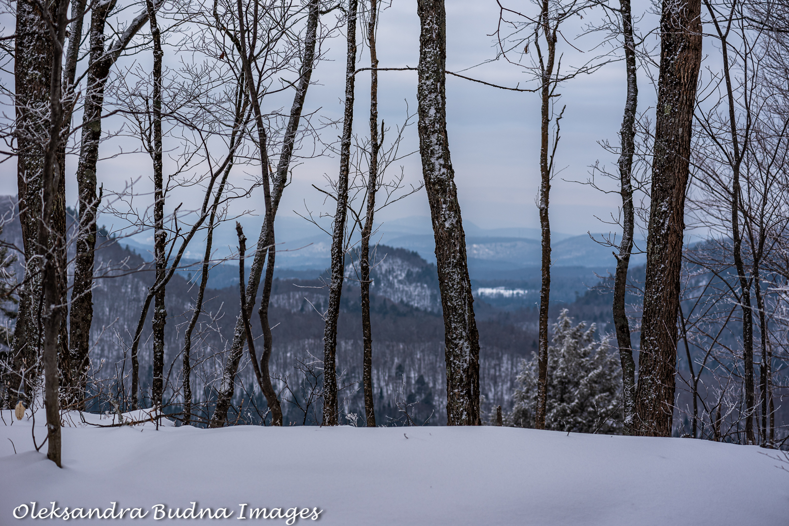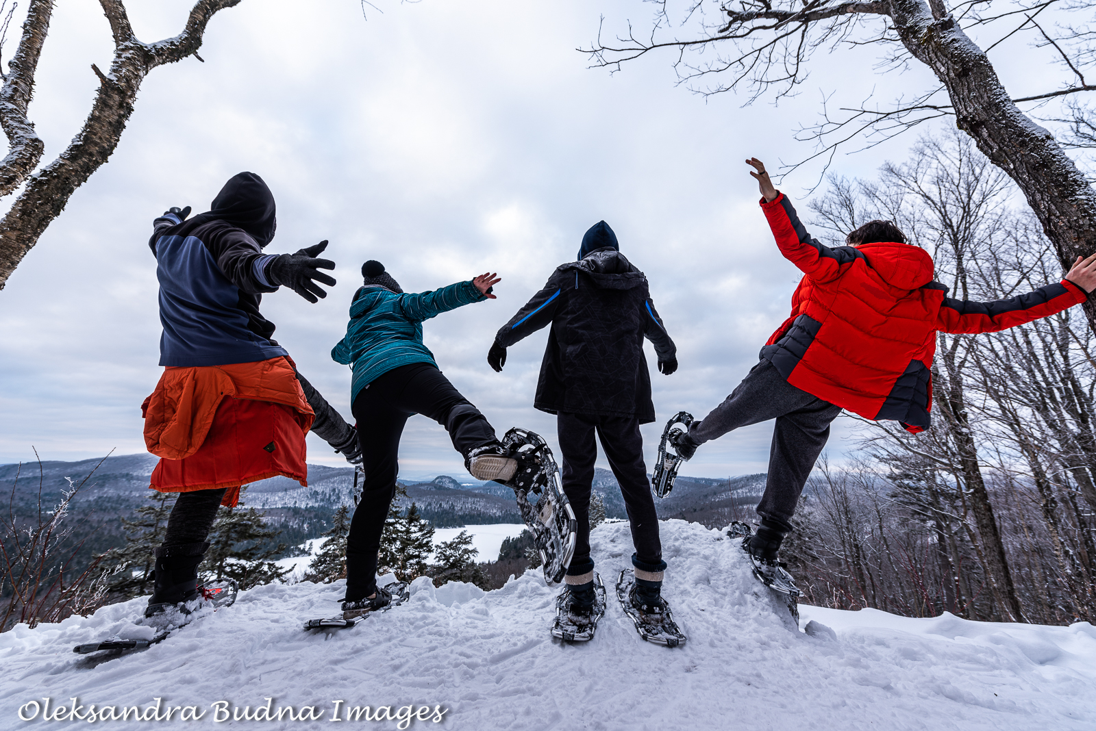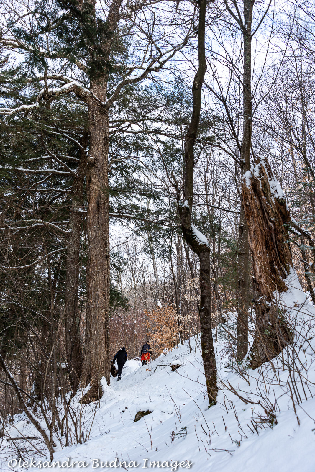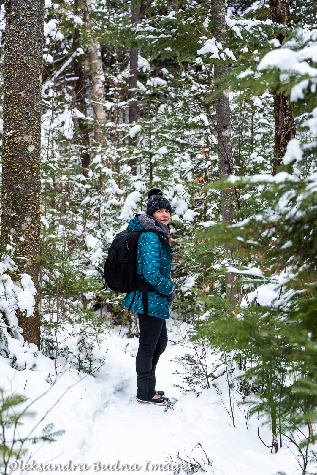 We roamed the park’s many trails. We snowshoed Le Panoramique trail – a short but vigorous climb to a lookout that offered a captivating view of the Laurentian Mountains and a rare glimpse of the blue sky peeking through the grey shield.
