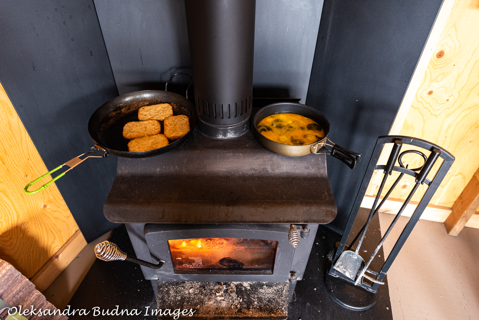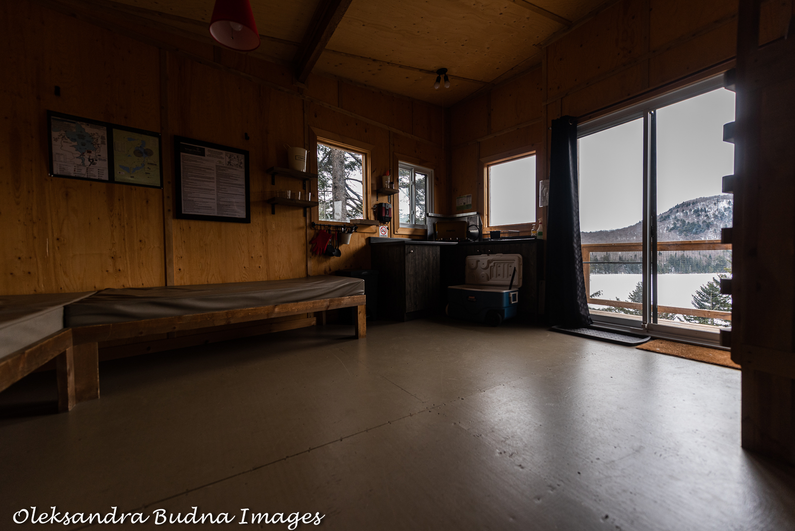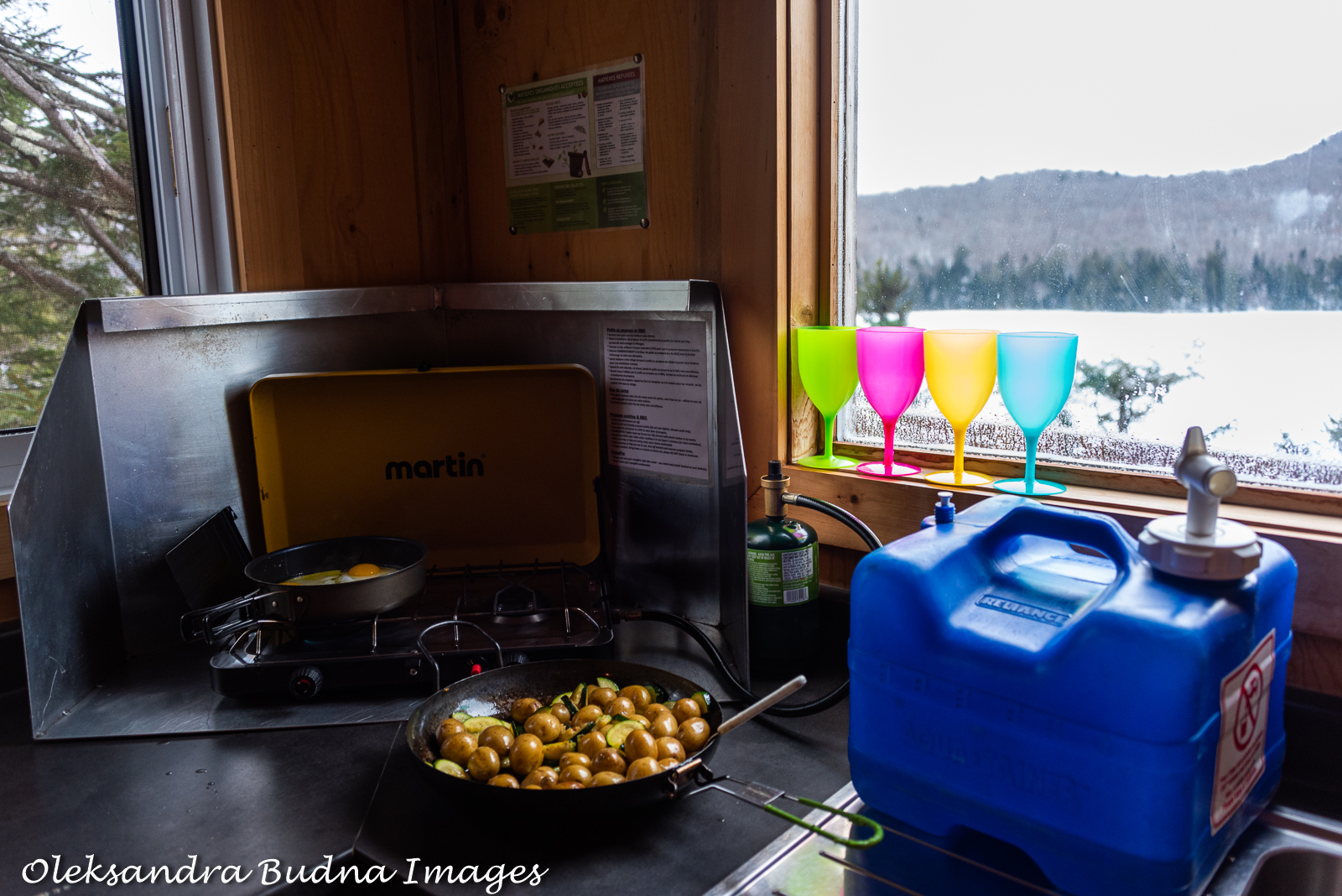 We stayed at Cliff House 18. It was pretty spacious and featured beds for six people, a kitchen area with a propane stove (you can bring your own gas or purchase it at the reception), plus all the cooking and eating paraphernalia. There was also a folding table and chairs, and a woodstove. In the winter, the resort provides one bag of ecologs per night (we only used half of ours; the cabin is well insulated). Wood for the outdoor campfire needs to be purchased separately. There’s electric lighting in the house but you have to rent a power pack. Potable water is available at the reception. Two 15-litre water containers are provided for free: one for drinking, one for washing dishes. We also brought our 23-litre canister so that way we didn’t have to go back and forth to get more water.