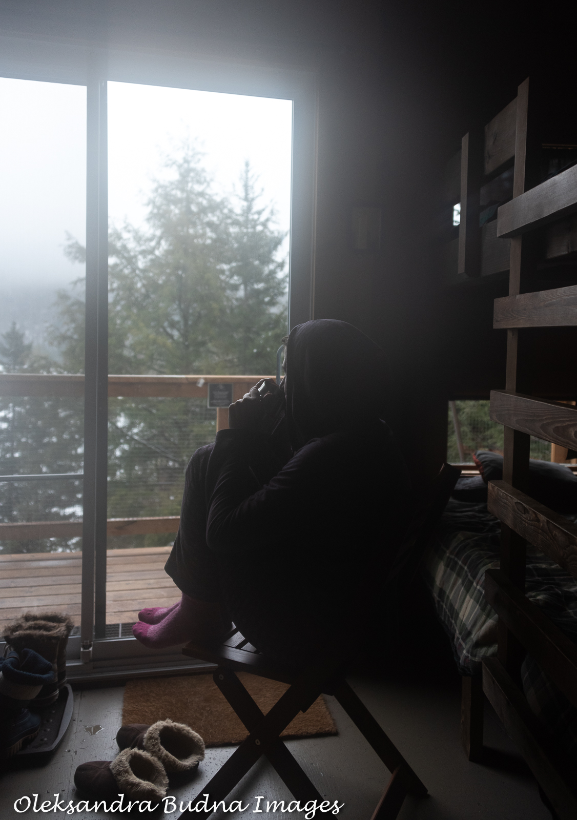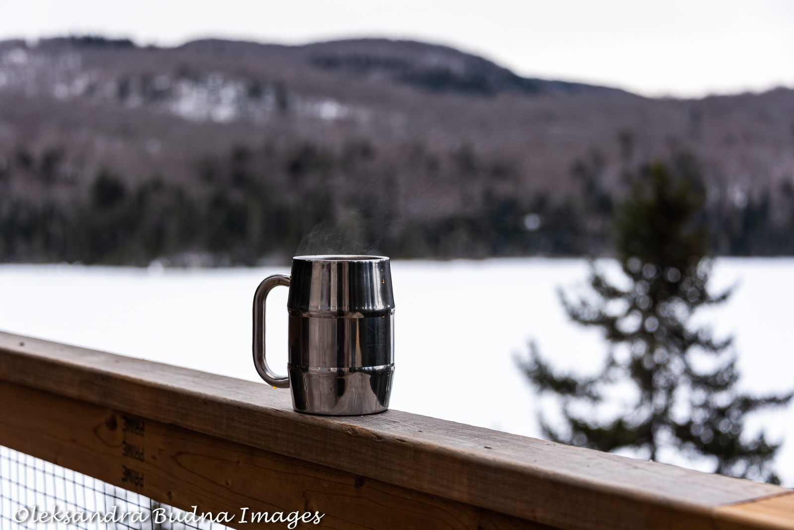 When I woke up the next morning, the opposite shore was obscured by a curtain of tiny snow pellets. I took my coffee outside where I sipped it watching the hills come into view. Blue jays swooshed back and forth and squirrels screeched with indignation or delight (it’s hard to tell with squirrels). With every sip of coffee, I could also taste serenity and stillness, the taste that has become elusive in the whirlwind of news over the past few weeks. Here, in this tiny house perched on top of a cliff, on this balcony hovering over nothingness, I could finally let go of anxieties and worries over the future and just be.
