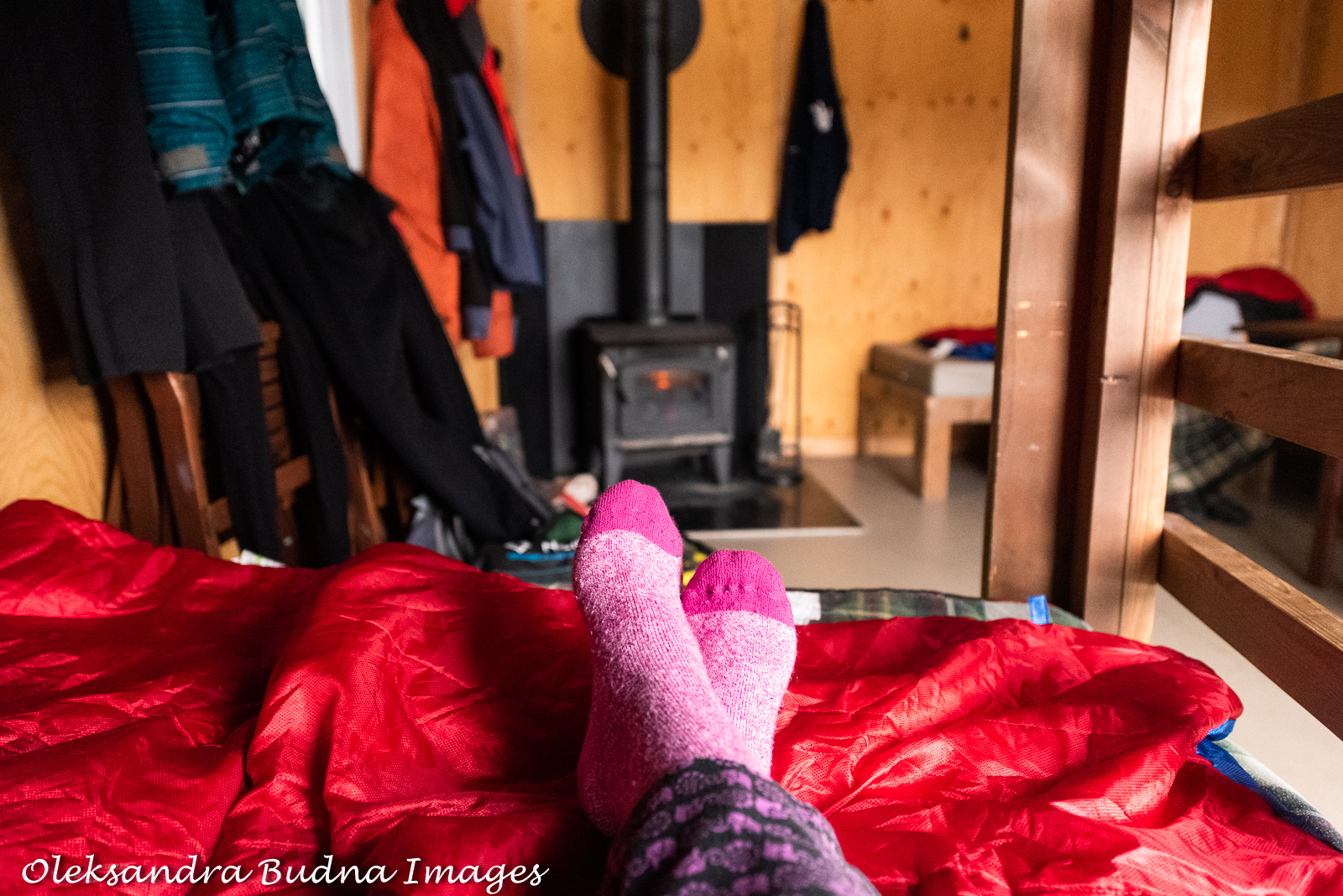 Our first introduction to the cliff house, however, happened in the dark. By the time, we arrived in the park, registered at the reception, picked up a power pack for the lights and wood for the stove, filled canisters with water, loaded our sleds and finally pulled them at the back of our cabin half an hour later, the sky was already inky blue. While we could see a glimmer of ice and snow through the grate down below, the full splendour of the views both in front and underneath didn’t fully reveal itself until the next morning. On that first night, we enjoyed the comforts of the indoors: the warmth of the stove, Louisiana-style curry from Backpacker’s Pantry and multiple rounds of board and card games.