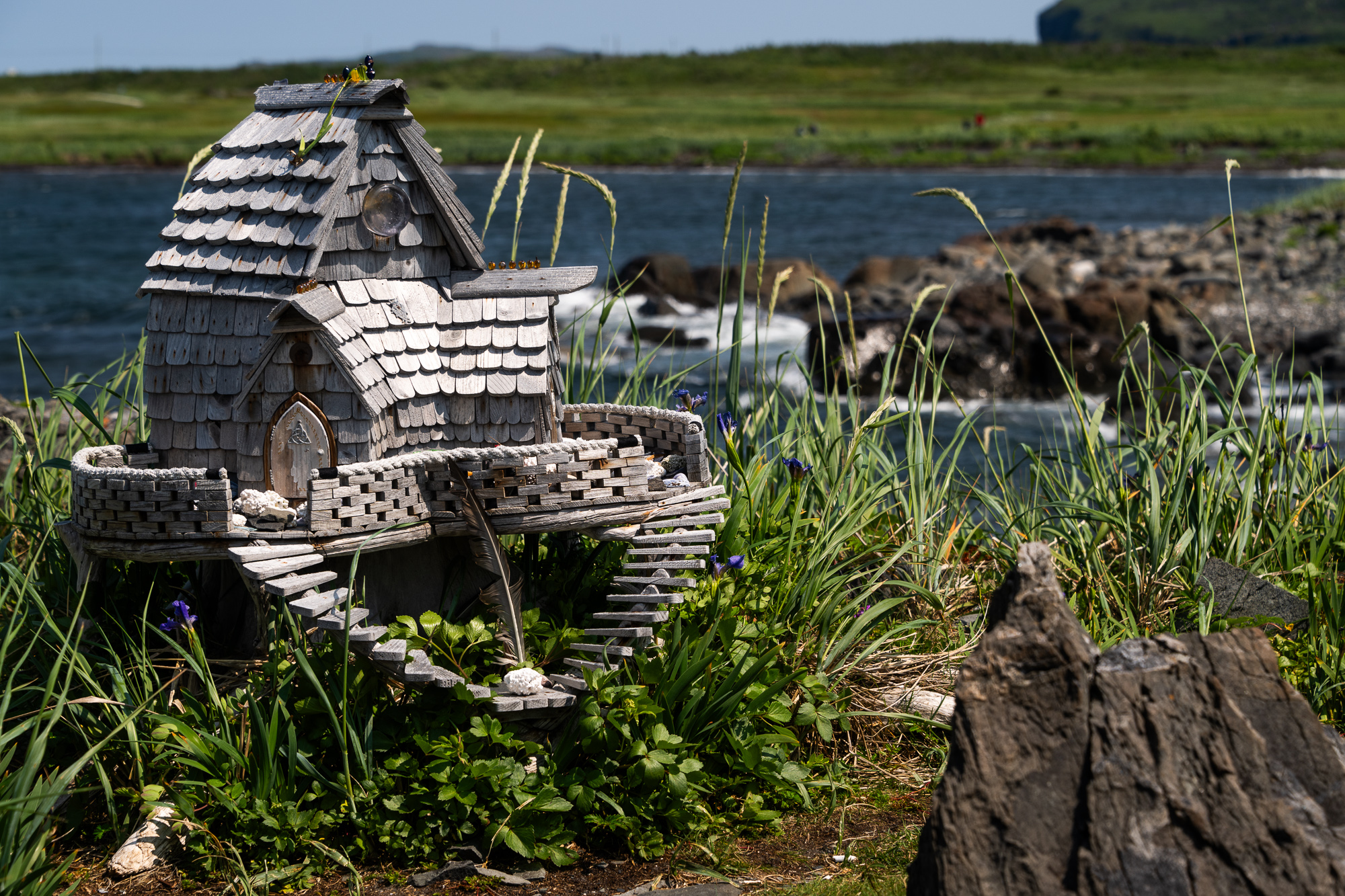 Before leaving L’Anse aux Meadows, we tackle the Birchy Nuddick trail. Although “tackle” is probably too big of a word for this mostly flat trek that winds through boggy areas, past tuckamores, along rocky shores of Strait of Belle Isle. We come across a few small houses. They are called “álfhól” and are built in Iceland for the Huldufólk, or “hidden people,” who are believed to be elves. I look for something to add to an already generous collection of presents by the door. In my camera bag, I find some shells from our trip to California a couple of years ago – a fitting gift for elves.