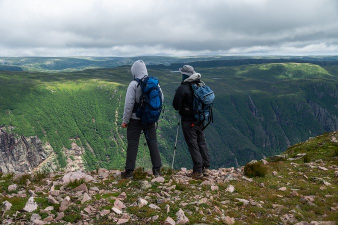 Speaking of the Gros Morne Mountain hike, it starts on a sunny, if a little chilly, morning. As we finish the 4.5-kilometre approach section, it gets warmer, and we shed a few layers. I even consider unzipping my pant legs. We begin our climb to the top, and I quickly realize how premature that would have been. Somewhere along the way we start putting the layers back on in whatever order we can locate them in our backpacks. Eventually, we end up with sweaters worn over windbreakers because the mere thought of taking them off to put sweaters on is chilling. Our plans to have coffee at the top are swept away by the wind, so cold and biting that all we can think about is to get off the mountain. We stop at the Ferry Gulch campsite instead.