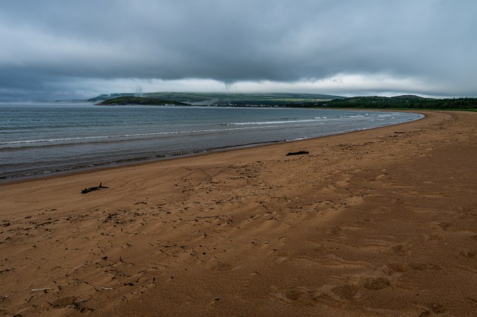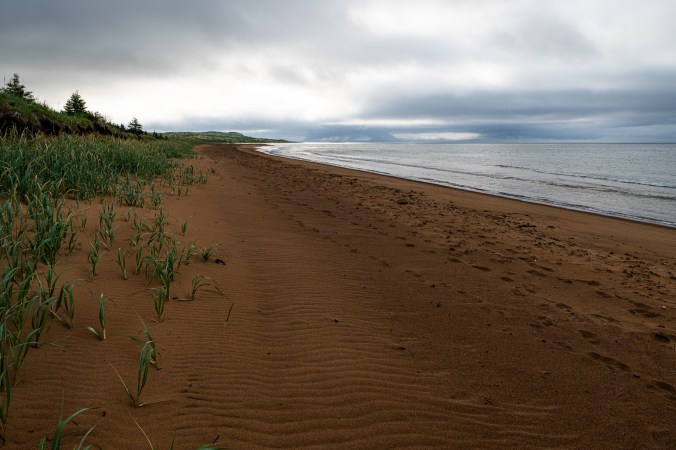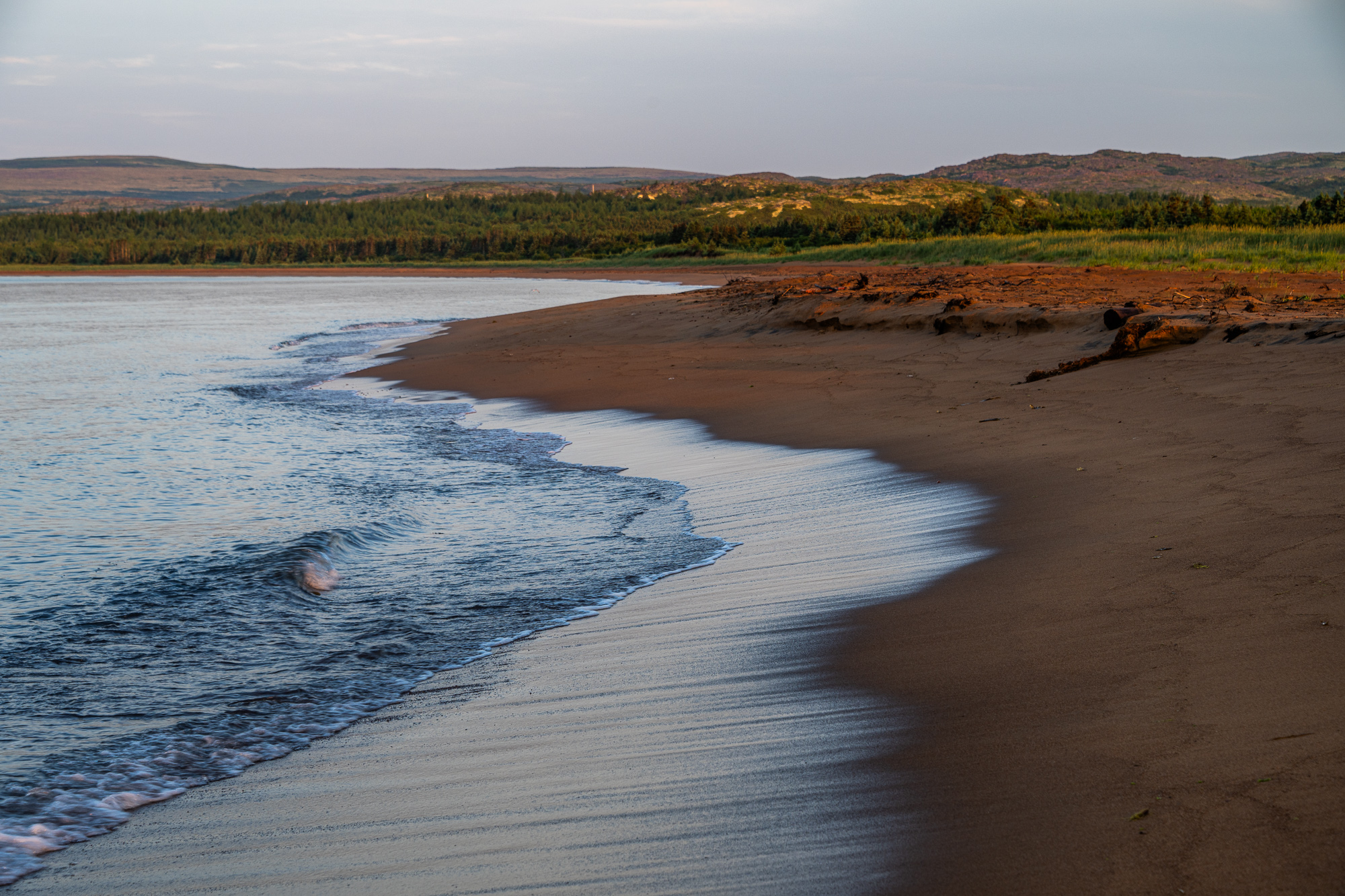 I walk along the beach to the confluence of Pinware River and the Strait of Belle Isle. The sky is cloudless. There are no dramatic colours, just a strip of orange and a few pink whisps slowly dissolving into the blue of the sky as the sun emerges from behind the hills. Right on cue come the flies. After another half an hour of wandering on the beach, I retreat into the tent. Just a few more minutes of fly-less peace before we get to making breakfast.