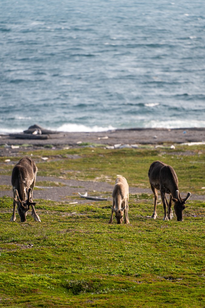 The next stop on our route is Port aux Choix, a national historic site that tells a story of Maritime Archaic, Dorset, Groswater and Beothuk peoples. We arrive after 5 on a Sunday. The visitor centre is already closed. But it’s not the only reason we came. The last time we visited, we saw woodland caribou wandering around. Unlike the whales in St. Anthony, the caribou are still here. In fact, there are more of them – a whole herd grazing by the sea.