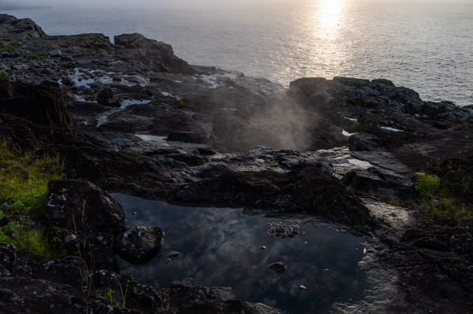 The next morning, my husband and I wake up at 4:30, pack our coffee paraphernalia and my camera, and head to the Spout a little under a kilometre away. By now you are probably wondering what it is, so let me explain. The Spout is a wave-powered geyser. Water from the river drains down a hole into a cavern below where the pressure from the waves pushes it back up into a cloud of mist. The frequency and size of the puff depend on the waves, and as luck would have it, we arrive on a calm morning. Still, it is a cool phenomenon, and we have a lot of fun exploring it.