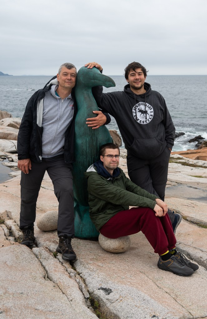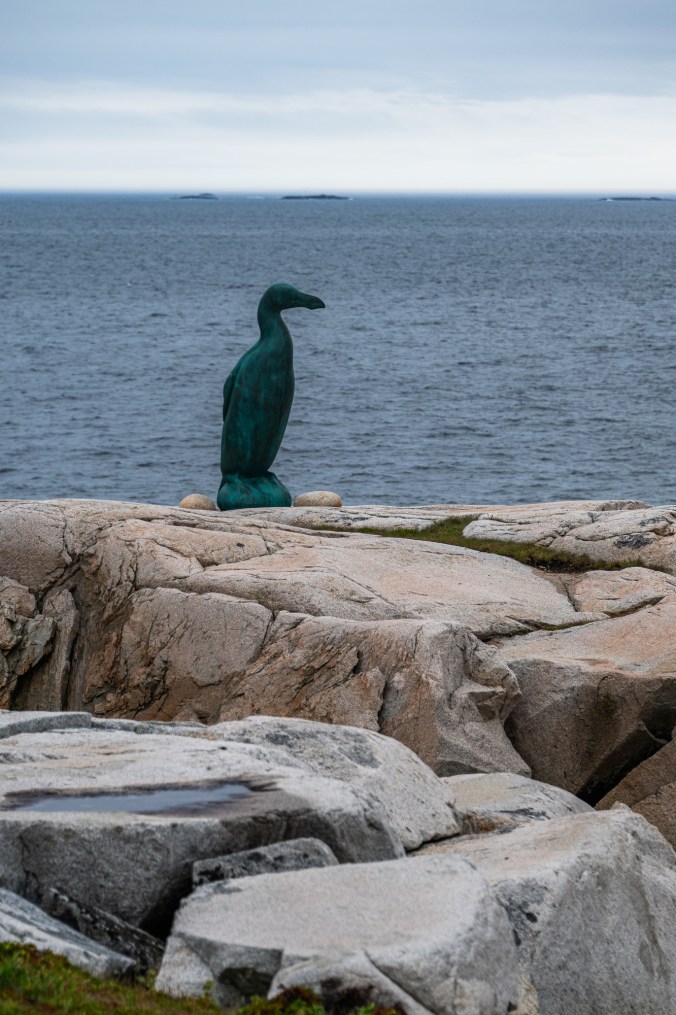 Eventually, we get to the statue of a great auk. This flightless bird once lived in North Atlantic, with the largest colony located on Funk Island 60 kilometres east of Fogo. The great auk held a lot of significance for the Beothuks who’d been living in Newfoundland prior to colonization. Both the bird and the people went extinct around the same time – mid-19th century. Both are a reminder of the devastating impact of colonization and uncurbed greed. The great auk was hunted to extinction by European colonists as a food source and for their down feathers. A cast-bronze statue now commemorates the bird. Created by artist Todd McGrain as part of his Lost Bird Project, it faces a similar sculpture in Iceland where the last known great auk breeding colony was located.