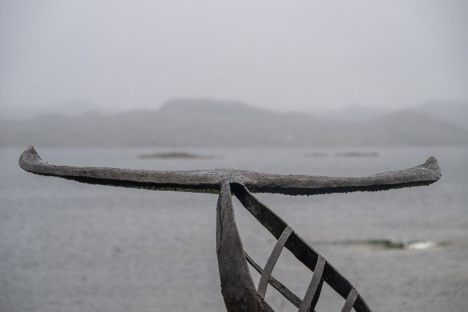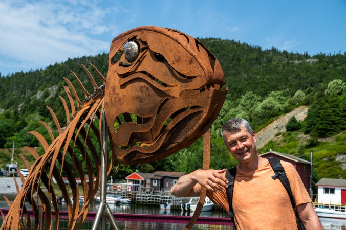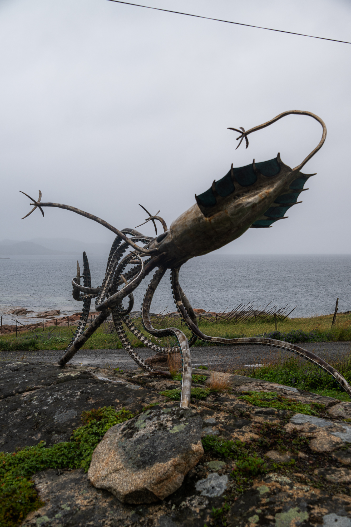 We pull by Fogo Island Metalworks in Shoal Bay and the first thing we notice is a giant metal squid overlooking the ocean next to a dragon fly and whale’s tail. There are also turkeys – not metal ones, actual live turkeys gobbling in a shed – and a garden. The squid will turn out to be the Kraken, a legendary sea monster from the Norse mythology. Marc Fiset, an artist behind Metalworks, draws a lot of inspiration from myths. He shows us his work in progress – “The Ferryman” of the Greek underworld who transports souls of the dead across the river Styx. The sculpture is to be unveiled the next day at the Burning Rock Festival, which Marc started a few years ago. We won’t be here so it’s exciting to get a sneak peek. Marc tells us about retiring to Fogo Island after his career in the military. We discuss our shared appreciation of dragon flies. And my husband asks about the process used to attach copper suction cups to Kraken’s steel tentacles. (For those not versed in metallurgy, like me, you can’t weld copper to steel.) We later find a metal sculpture of fish at Quidi Vidi Village in St. John’s. My husband immediately identifies it as Marc’s work before we even read the sign. The sculpture is called “The Fishery” and is indeed made by Marc Fiset together with fellow blacksmith Ian Gillies.