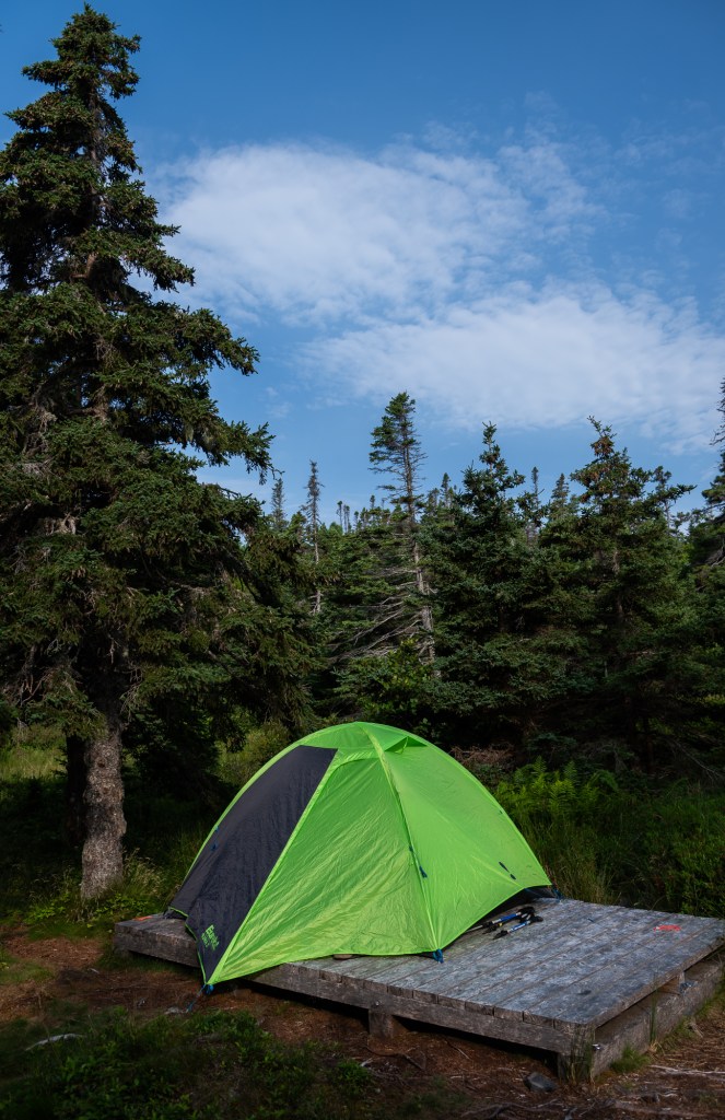 Campground is probably too big of a word for this small patch in the woods with 11 closely packed campsites (seven of them with wooden platforms) and a primitive outdoor toilet. A bit about that. Doing a lot of backcountry camping in Ontario, we are used to thunderboxes – simple wooden boxes with a hole and a lid (the thunder part is inspired by the sound the lid makes when dropped down). In Newfoundland, backcountry privies look more regal: these circular structures with a raised back and sides bring to life that famous euphemism for a toilet – although in this case a plastic throne, not a porcelain one.