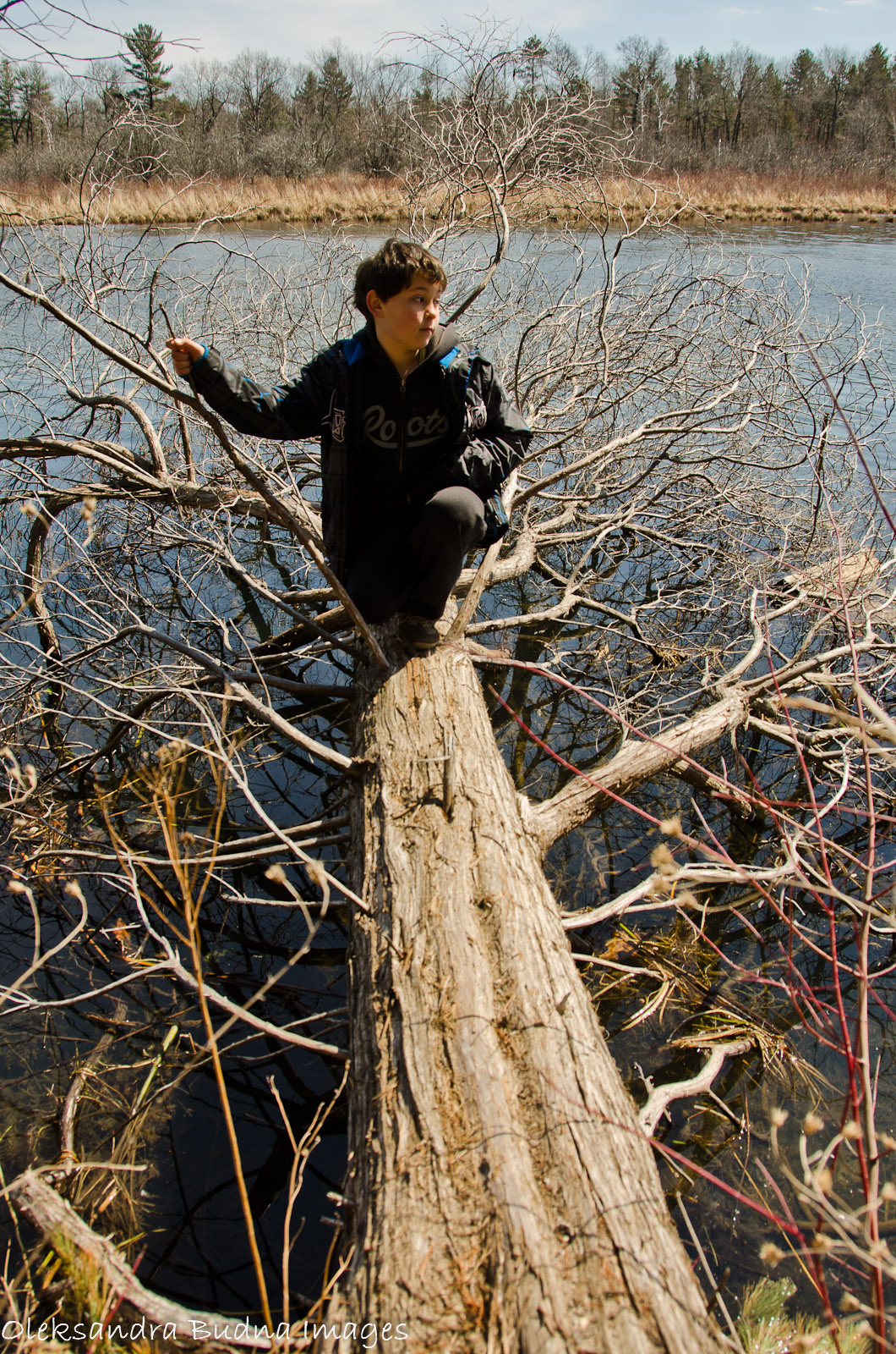 We spent the first half of the day biking around the park. In the summer, riding the 14-kilometre Savannah trail and finishing with ice-cream is a long established tradition. But since the ice-cream counter and the store were closed for the season, our younger son proclaimed that riding the trail would be pointless. We biked along park roads instead, explored the Old Ausable River Channel, which was still frozen on one side of the bridge and completely ice-free on the other. We even saw a lonely canoeist on the water and felt quite jealous of him but canoes were chained for the season as well.