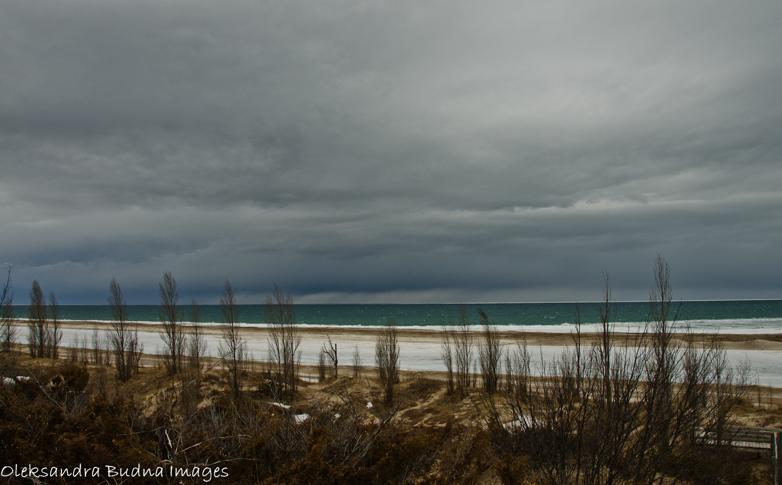 We then biked over to the beach. Lake Huron looked strikingly different from its usually cheerful summer self. Covered in ice and dusted with sand with a narrow strip of turquoise water in the distance and clouds overhead, it was eerily beautiful.