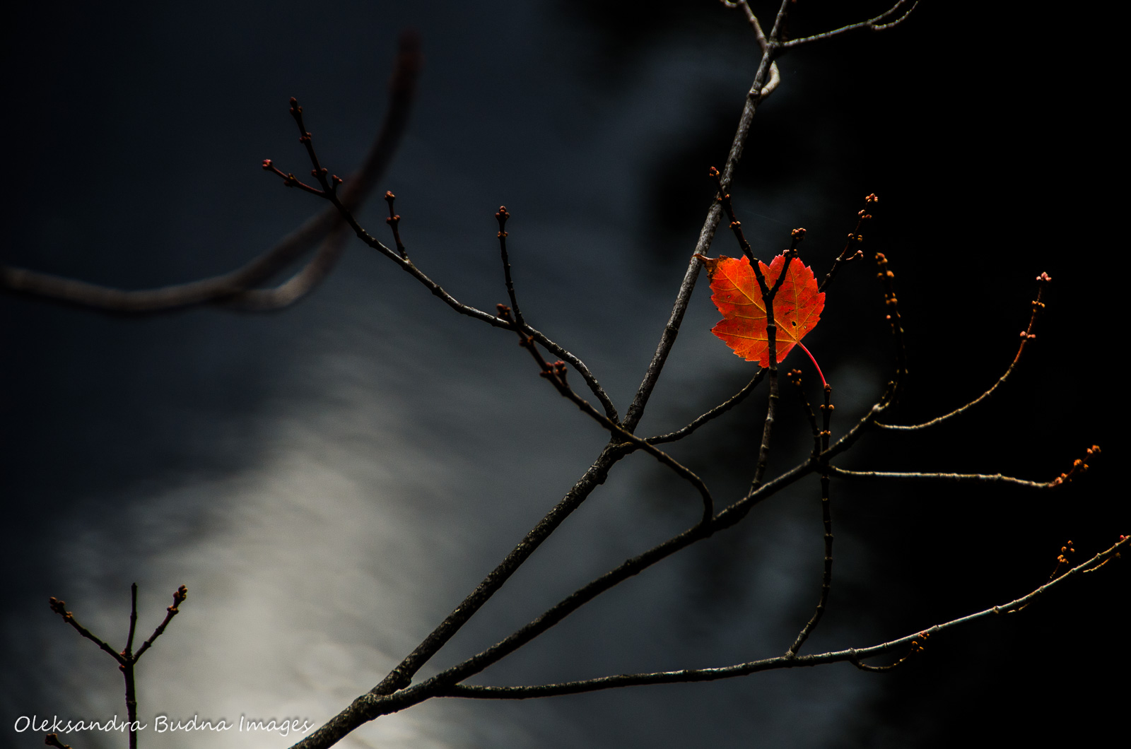 I zoom in on a lonely red leaf tucked in between bare branches. Not ready to let go of the tree that has been its home for the past several months, it is basking in the sun, blushing under its fiery gaze. Eventually, it will get whisked away by the wind and twirl its way onto the ground, adding its warmth to an already thick blanket. Or it will zigzag through the air and end up on the steely surface of the lake below, a tiny red boat gliding into winter. I wish good luck to a brave little traveller and continue on my way.