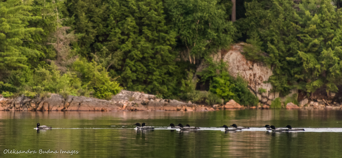 I spot two loons gliding across the lake as I push my canoe off the shore. The sun made a grand entrance about half an hour ago but then slipped behind the clouds. The lake is so smooth I am almost hesitant to break its surface with my paddle. I follow the trail left by the birds, and as I turn around the bend I drift into what looks like a loon party.