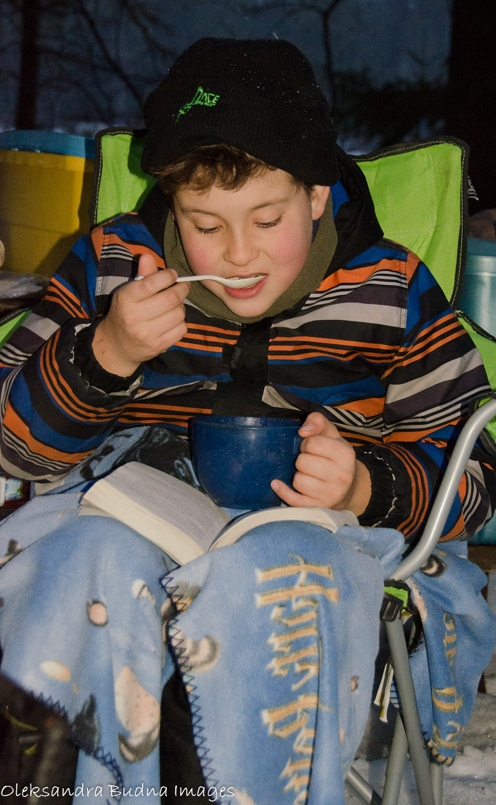 We don’t have a winter tent and, after reading all about it, I decided we could get away with our three-season one. There was no heavy snowfall in the forecast so we didn’t have to worry whether the frame would hold. The tent has a fly that extends all the way to the ground so it provides pretty good protection from the wind. We also added a tarp on top of it for some extra protection ensuring there was a good flow of fresh air. We added a tarp under the tent as well, plus two layers of sleeping pads for additional insulation from the ground. We also brought two sets of sleeping bags for everyone for extra warmth. And we did bring our small electrical heater so it wasn’t nearly as extreme as it sounds. In the end, no one was cold, although it was a bit chilly around dawn. The hardest part was getting out of the tent in the morning but with nature calling (pun intended) and a promise of coffee it was doable.